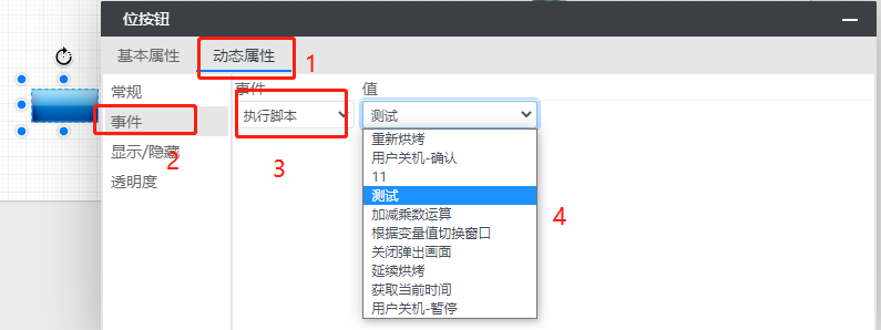 使用按钮等控件的“事件属性”,选择“执行脚本”后保存。