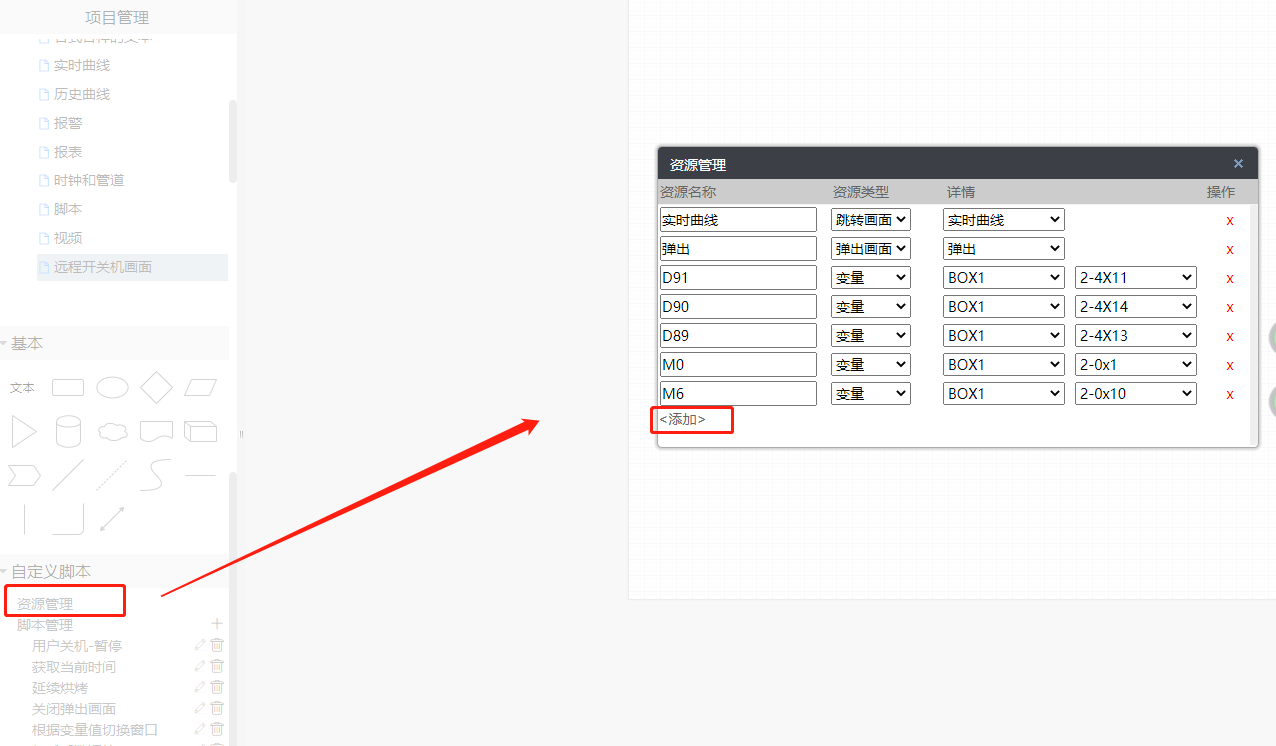 点击【自定义脚本】-【资源管理】,弹出【资源管理】页面,点击“添加”,输入资源名称,资源类型和详情。