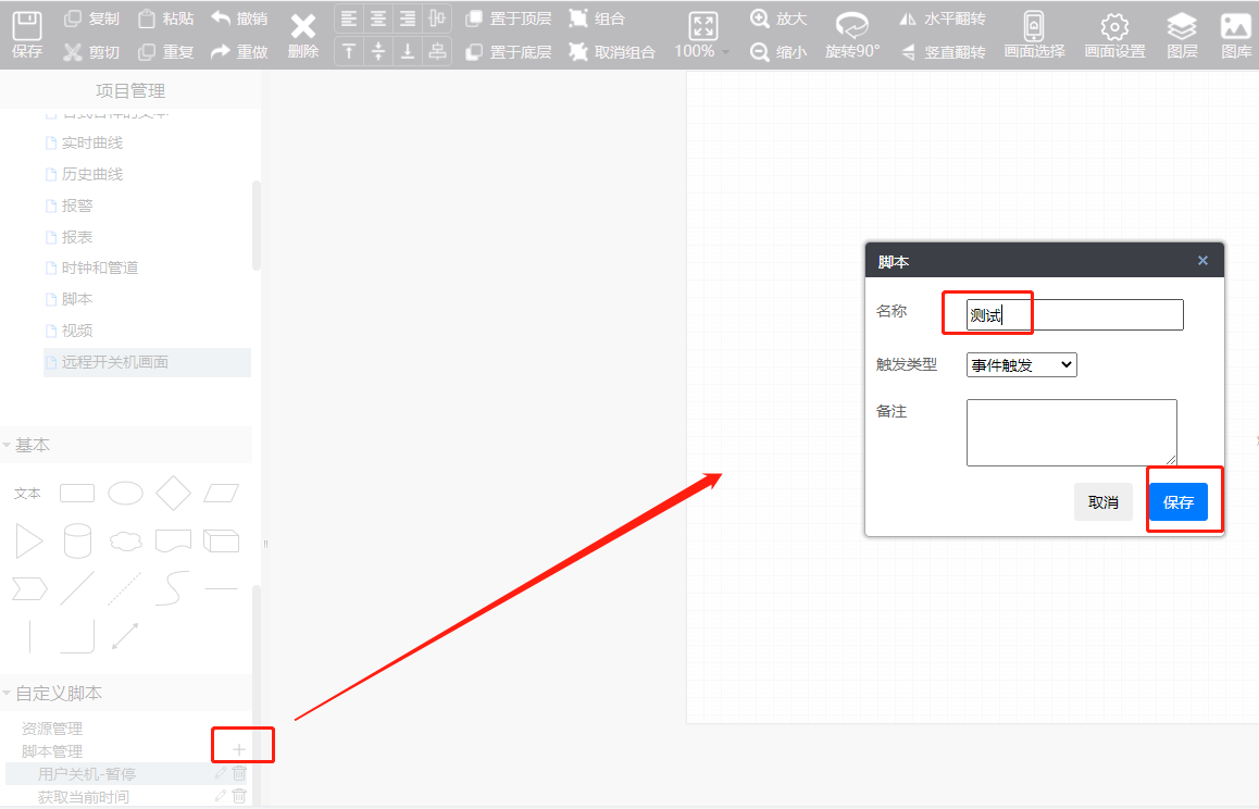 点击“脚本管理”的+号,弹出【脚本页面】,输入脚本名称后点击“保存”。