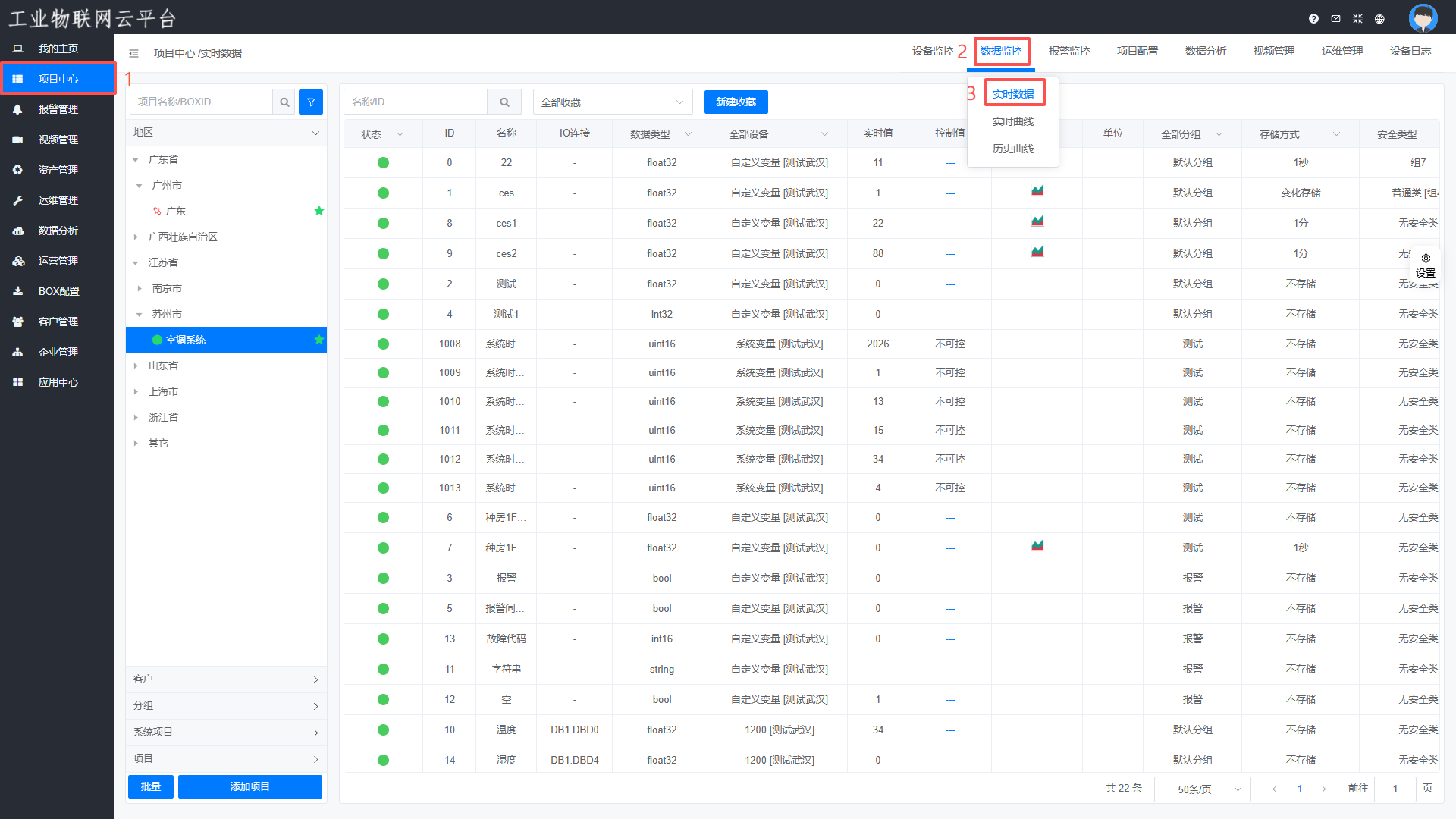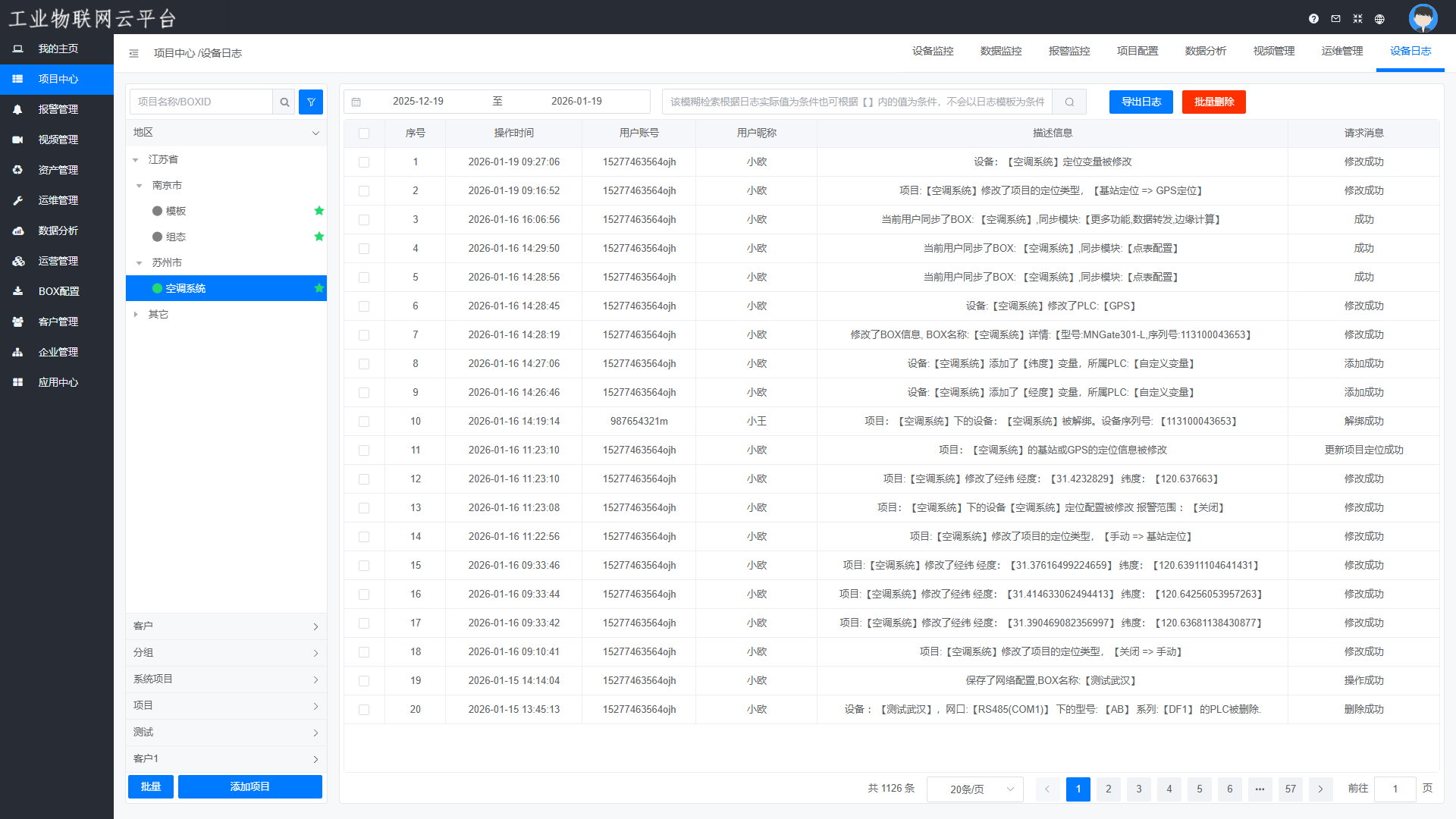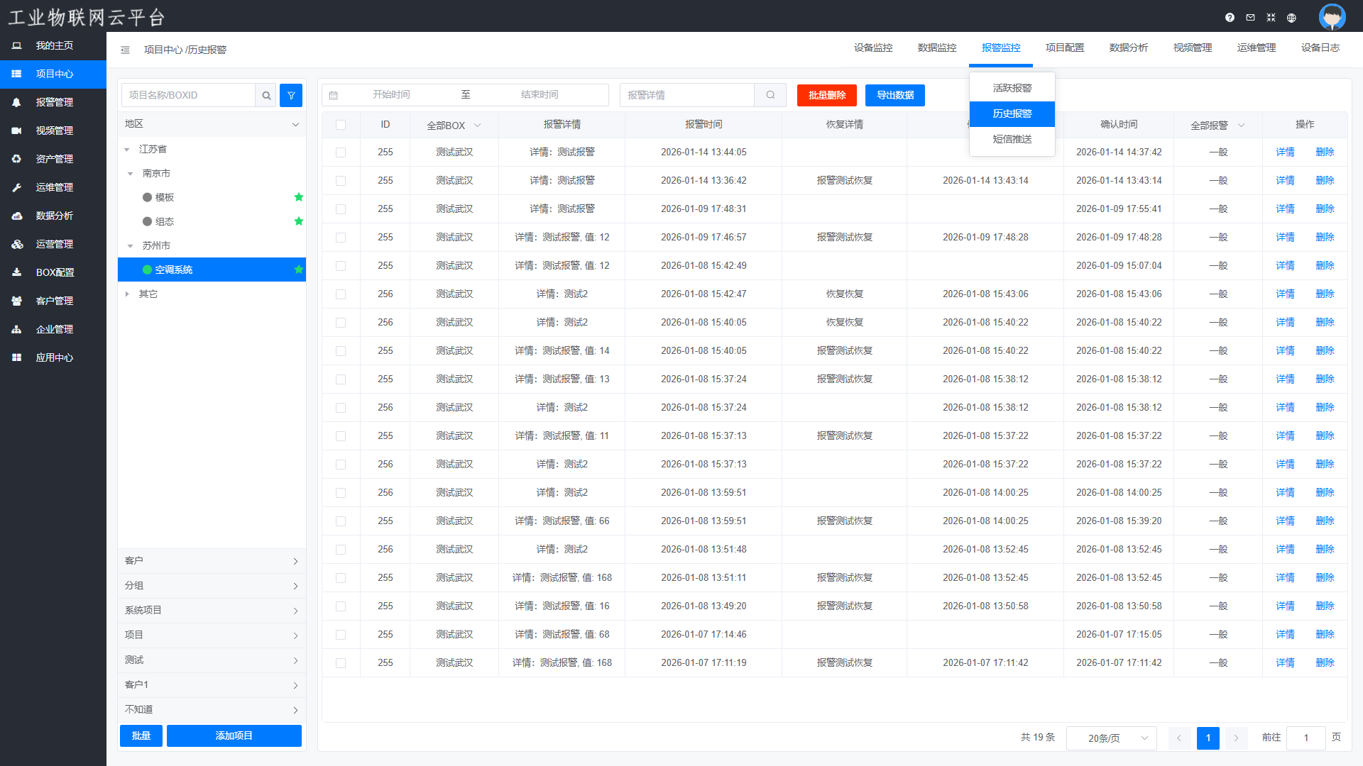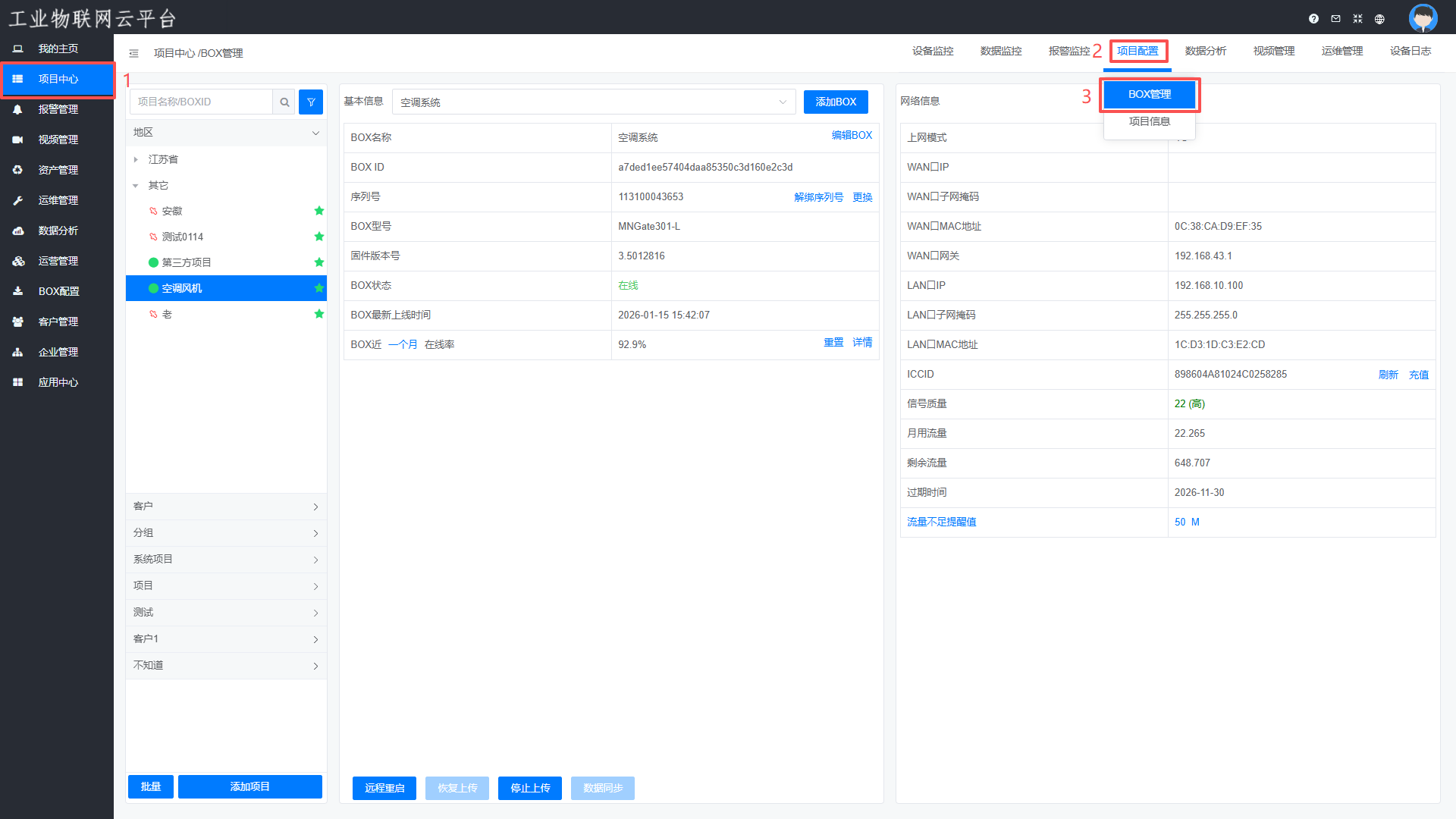 支持按项目名称、BOXID、BOX 状态、PLC 状态、报警状态、关注状态、绑定状态、项目类型、项目信息维度进行查询。