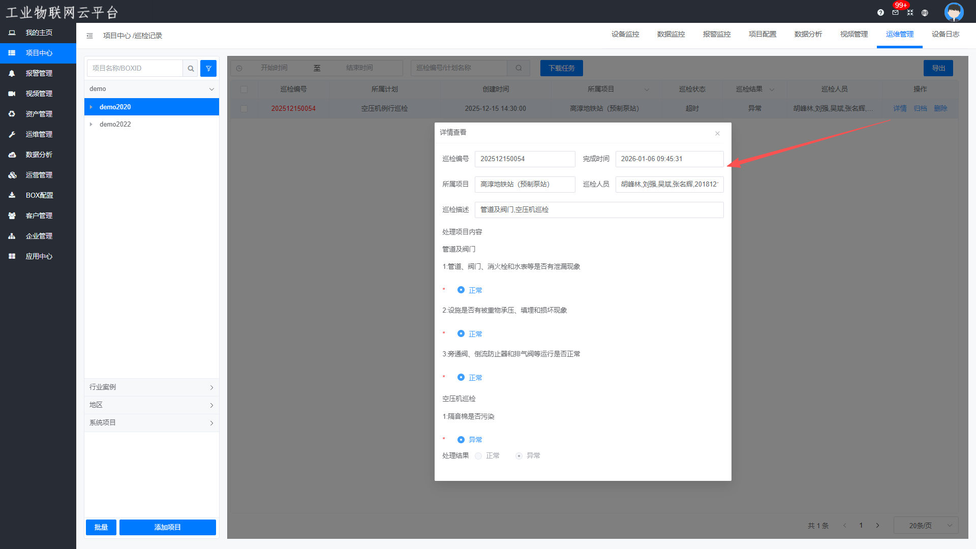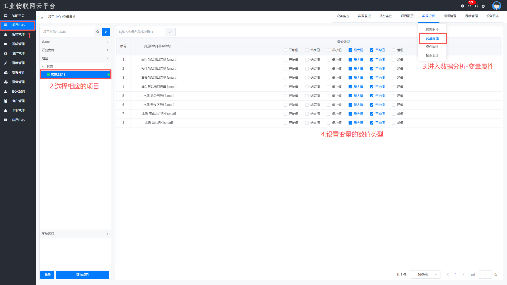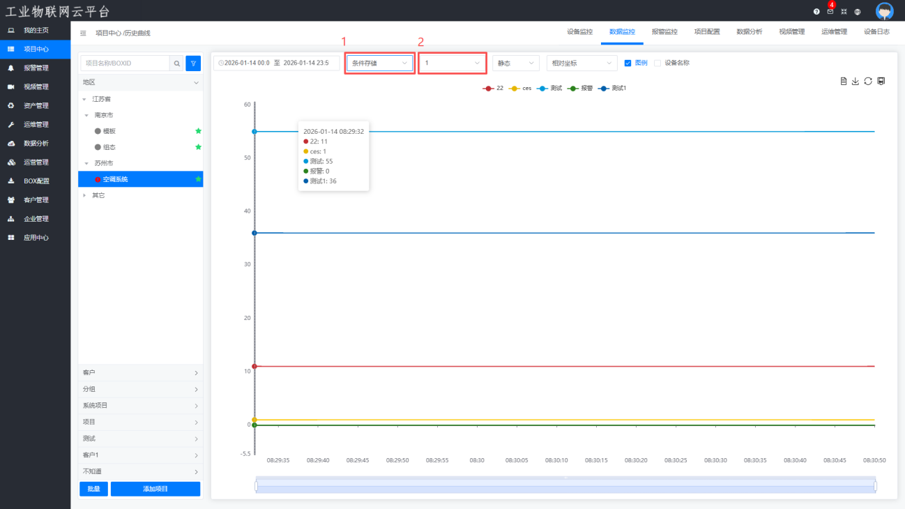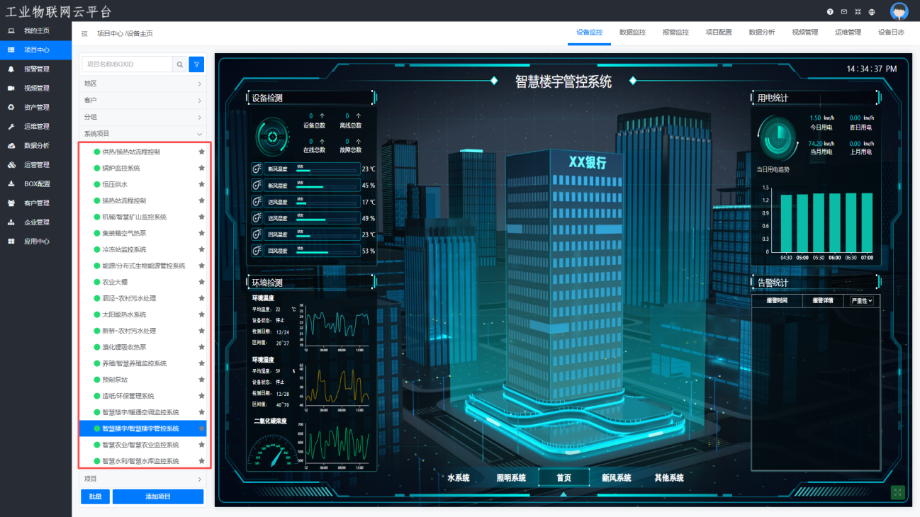 支持按项目名称、BOXID、BOX 状态、PLC 状态、报警状态、关注状态、绑定状态、项目类型、项目信息维度进行查询。