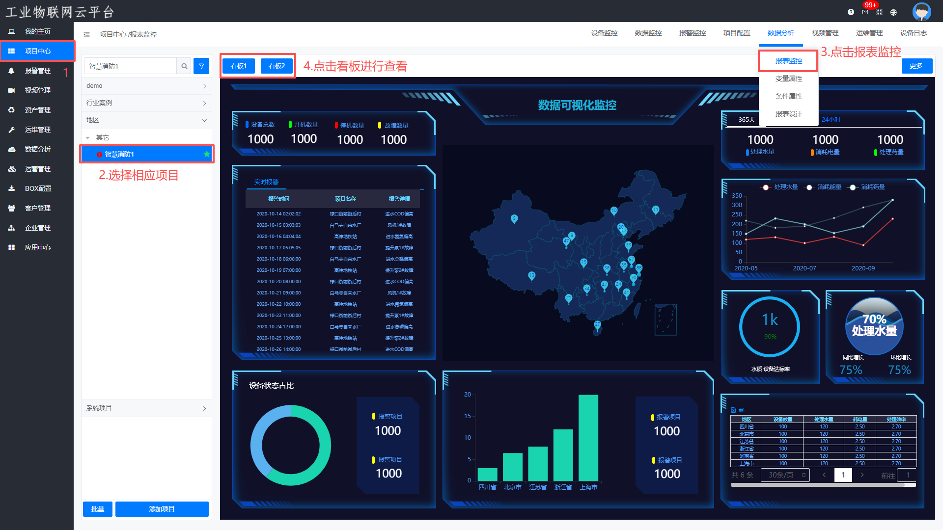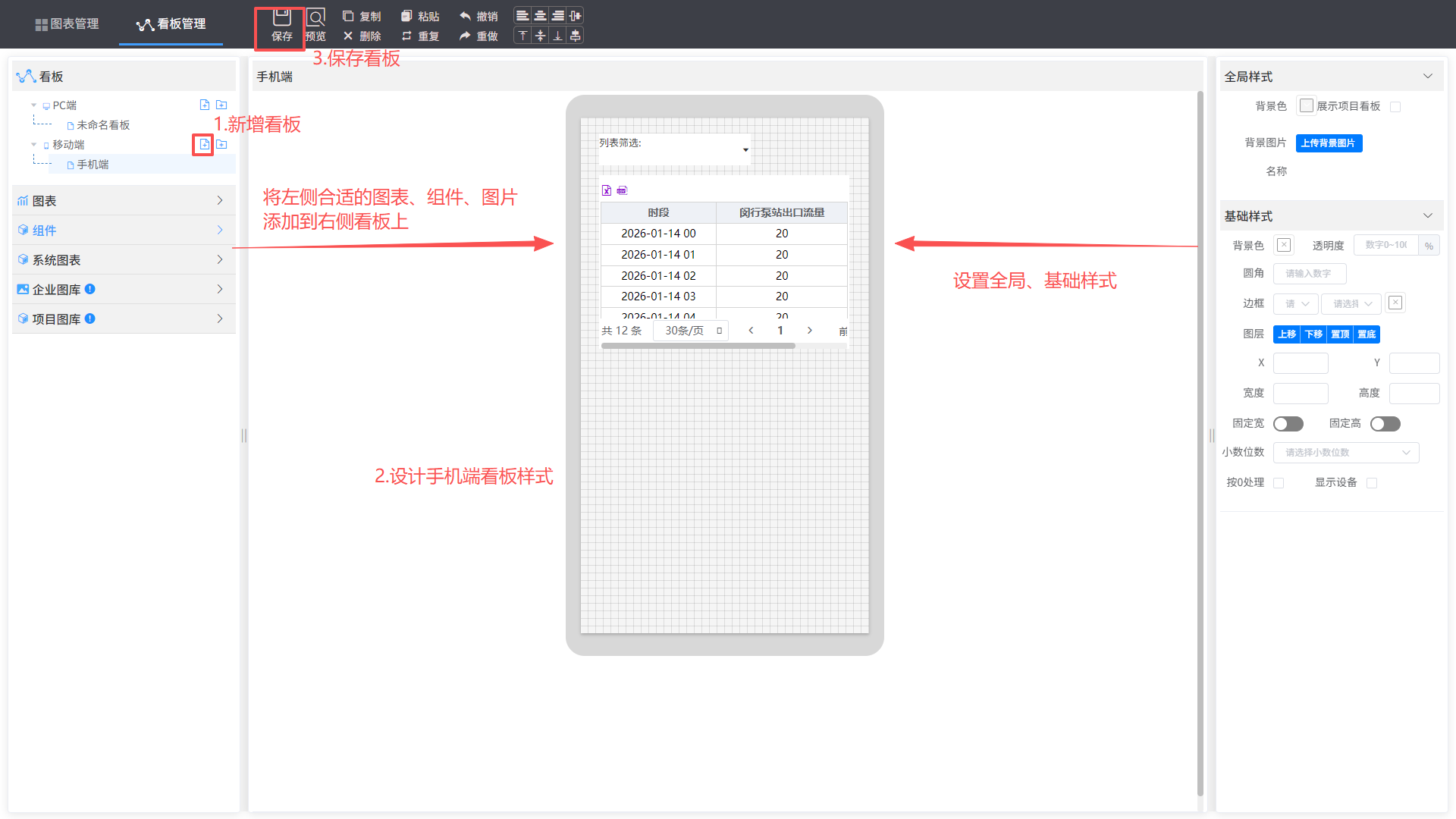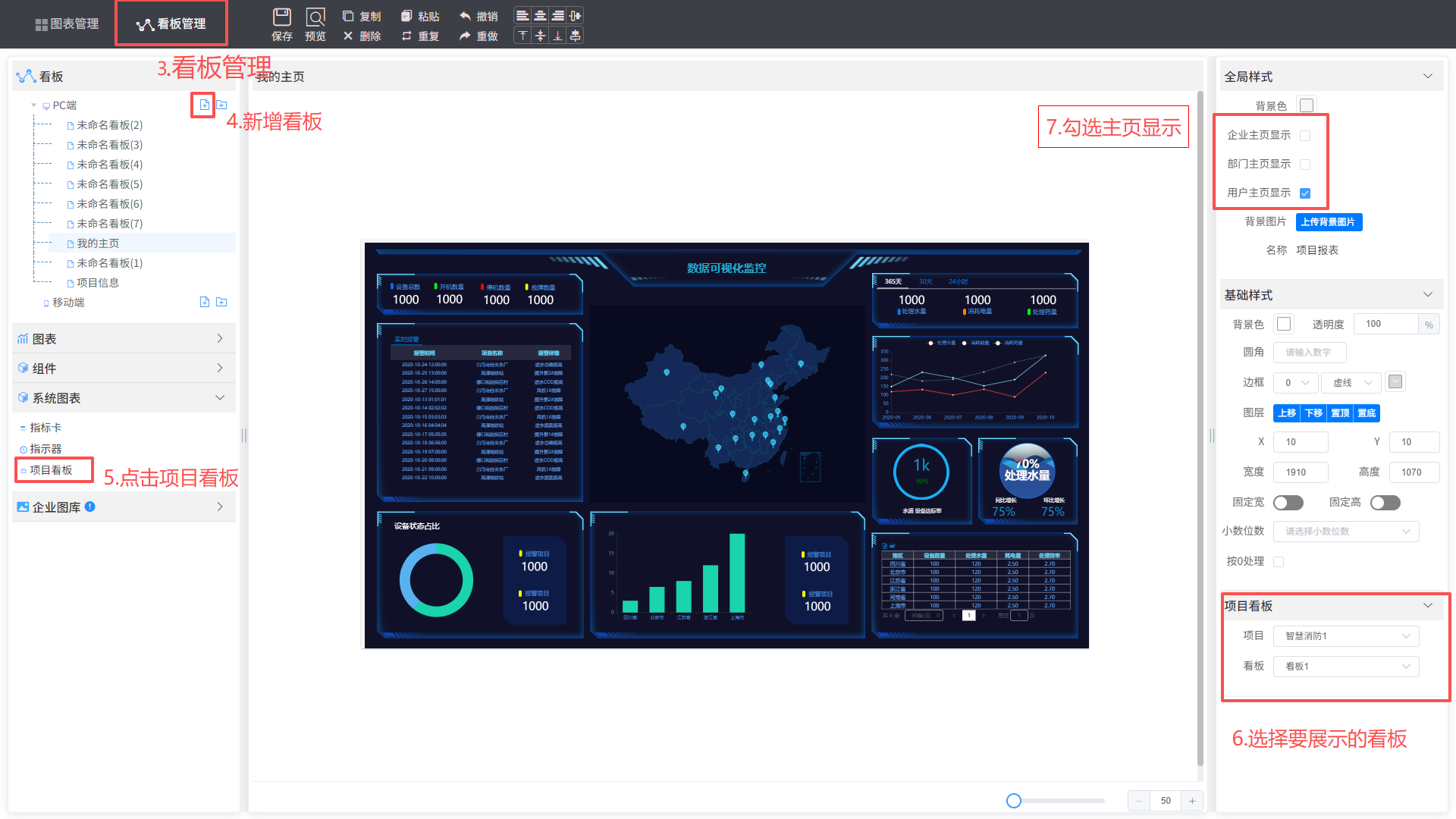 项目中心—>数据分析—>报表设计—>看板管理—>新增看板—>设置图表样式—>保存并查看