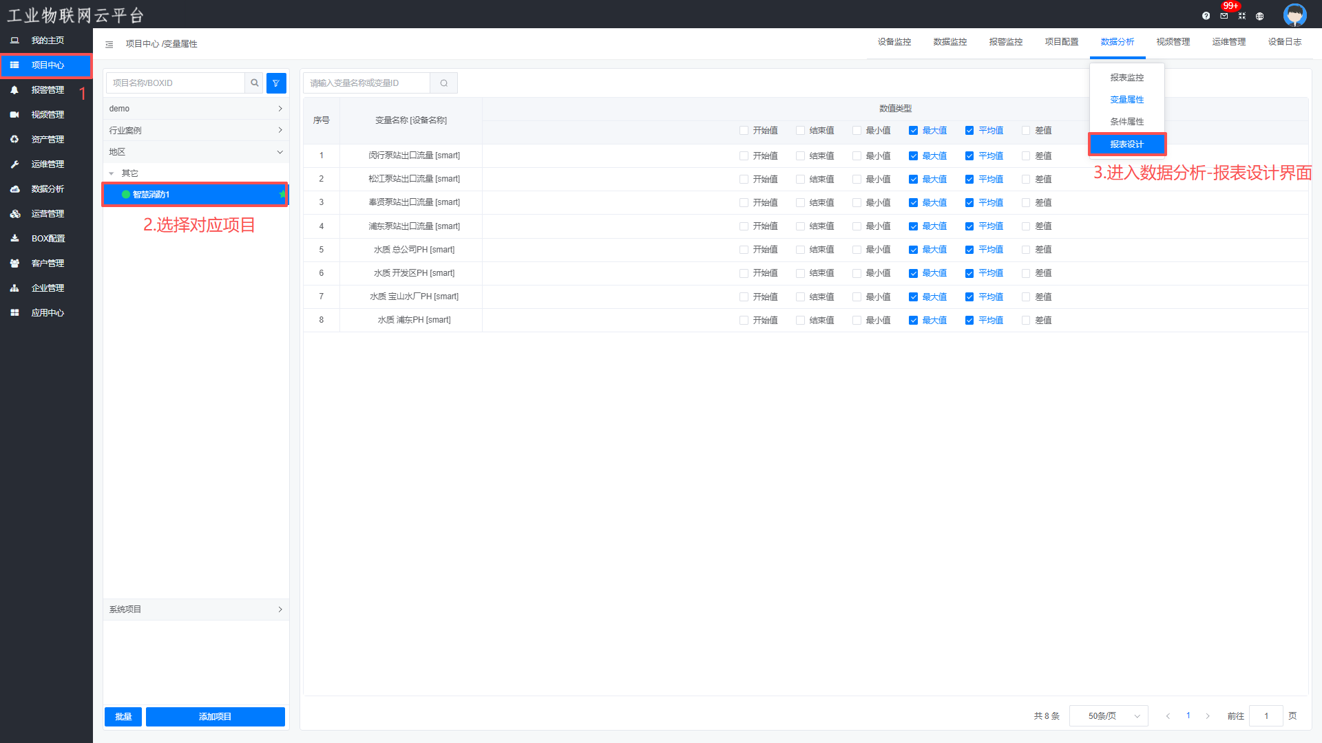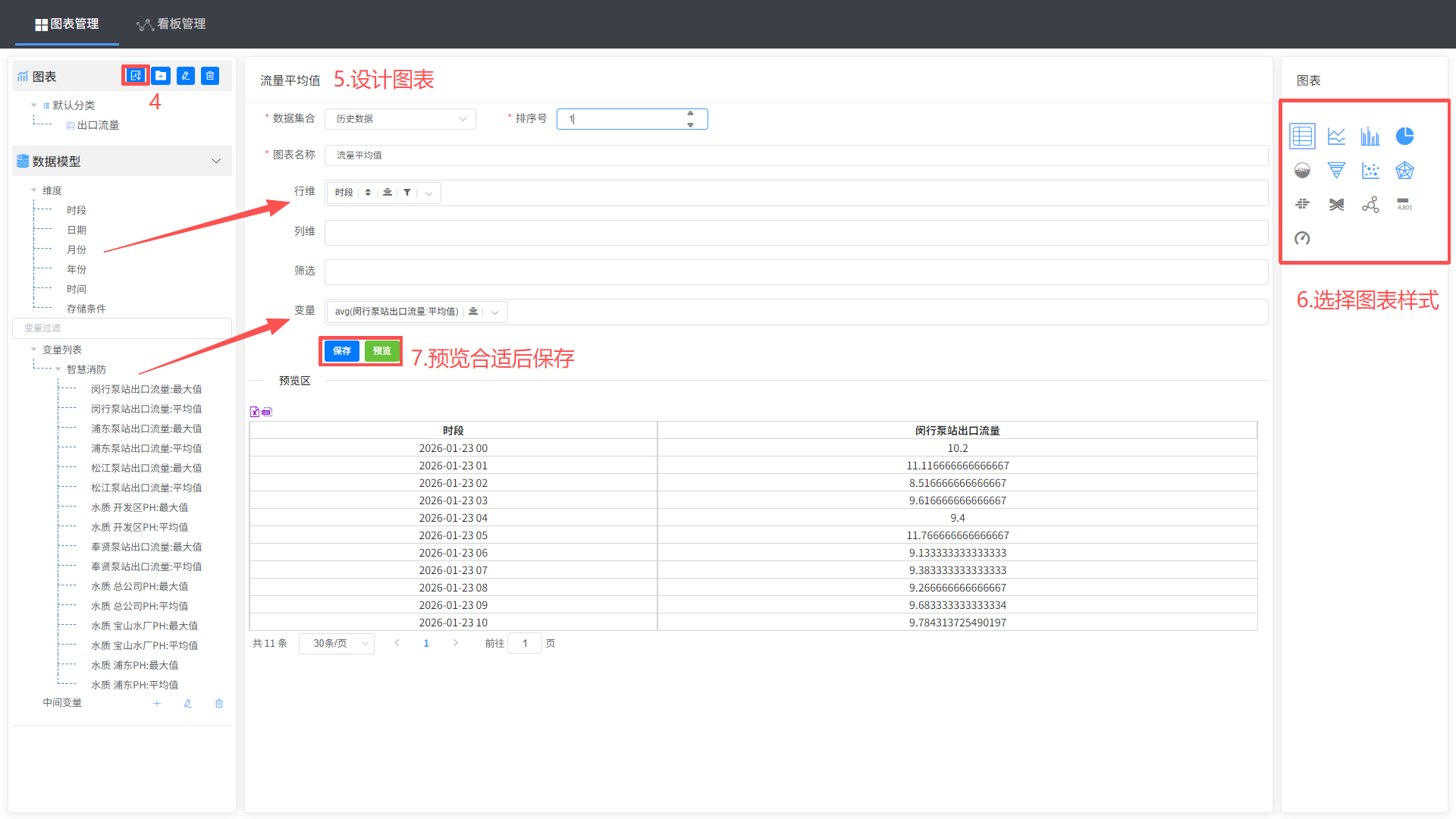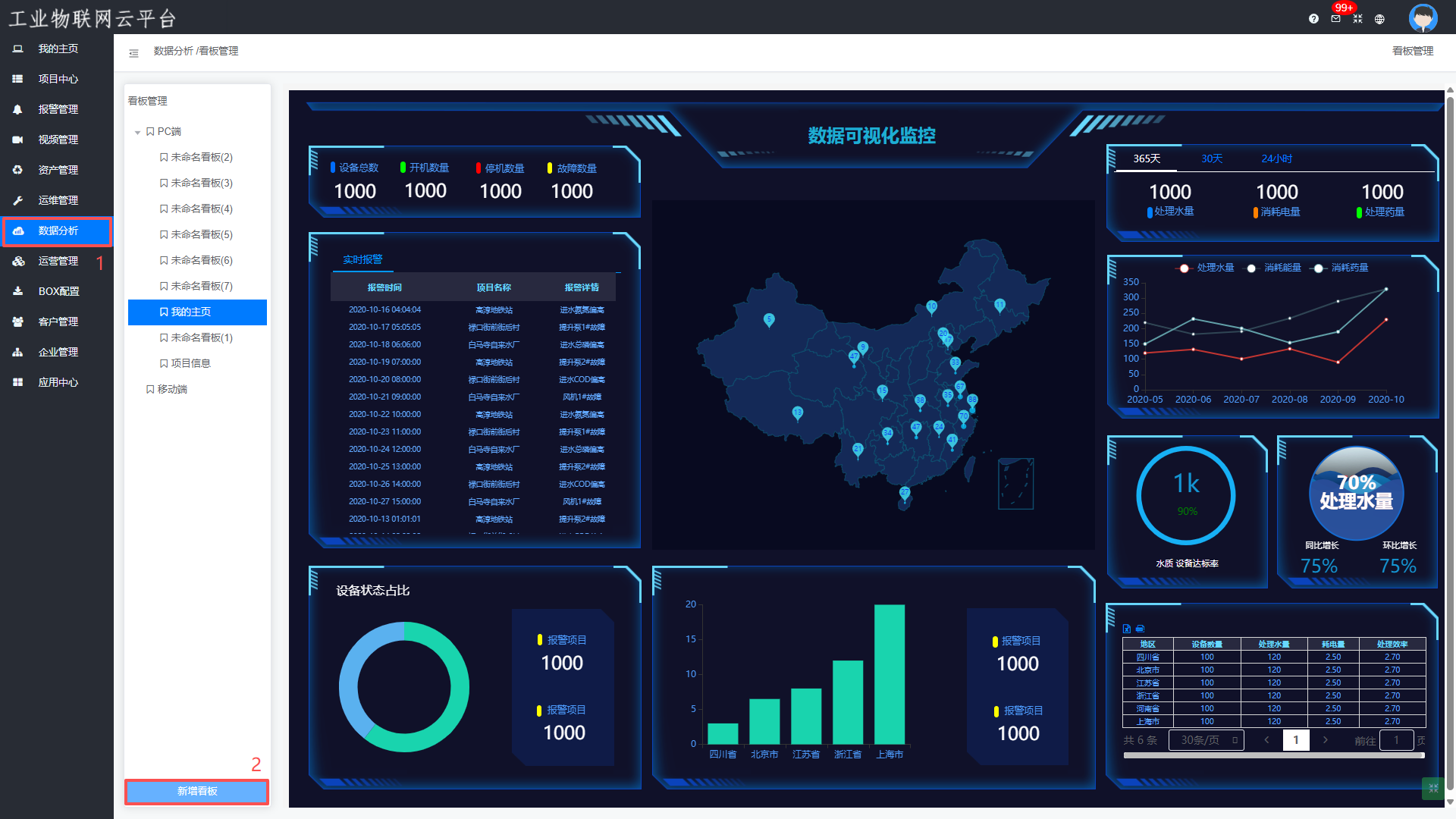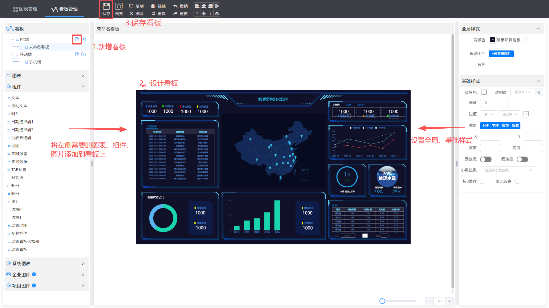 项目中心—>数据分析—>报表设计—>看板管理—>新增看板—>设置图表样式—>保存并查看