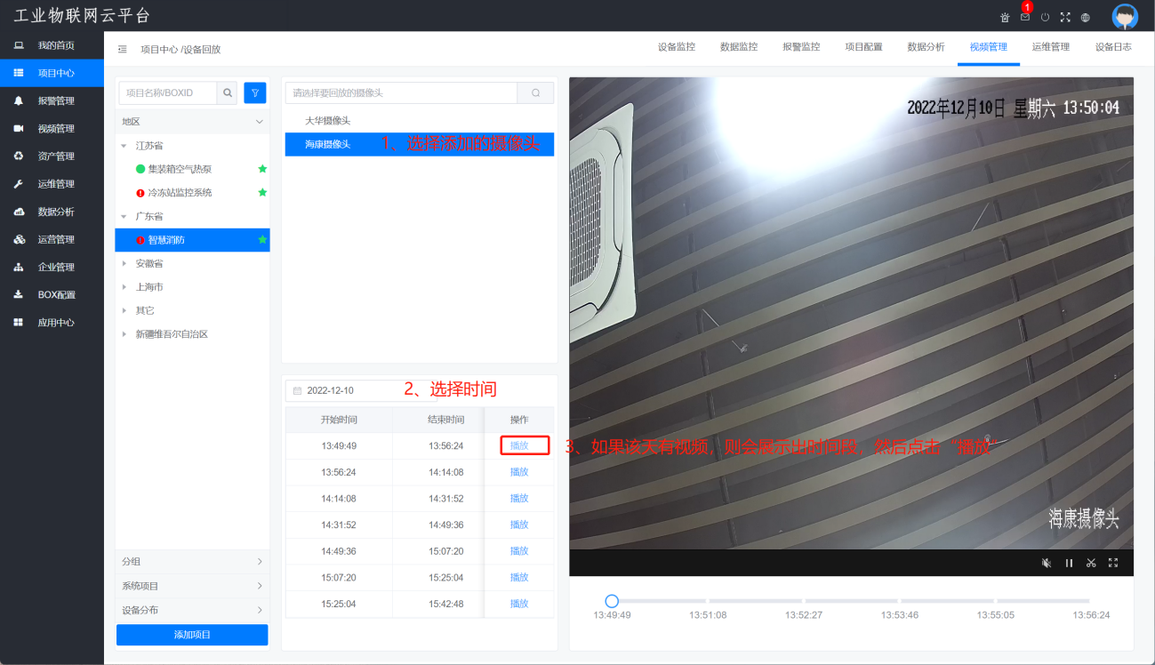 进入【视频管理】—>【设备回放】,选择摄像头,选择时间段,即可查看