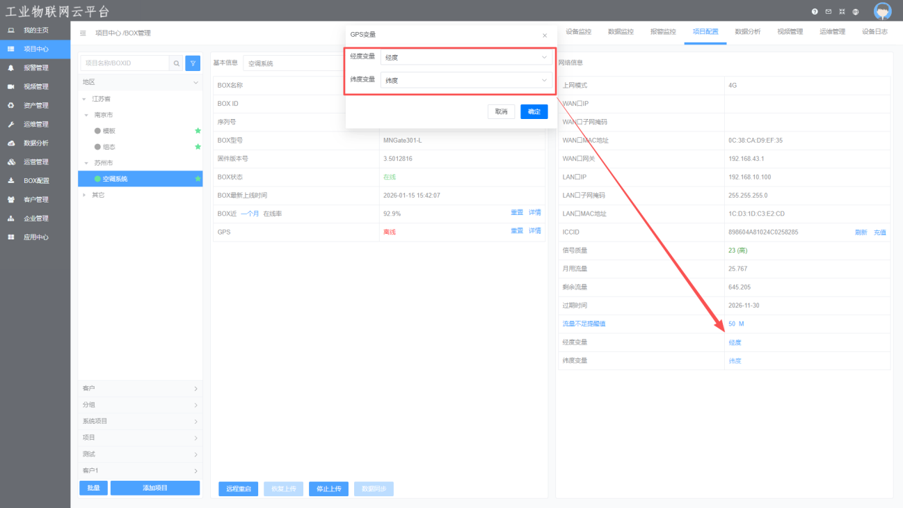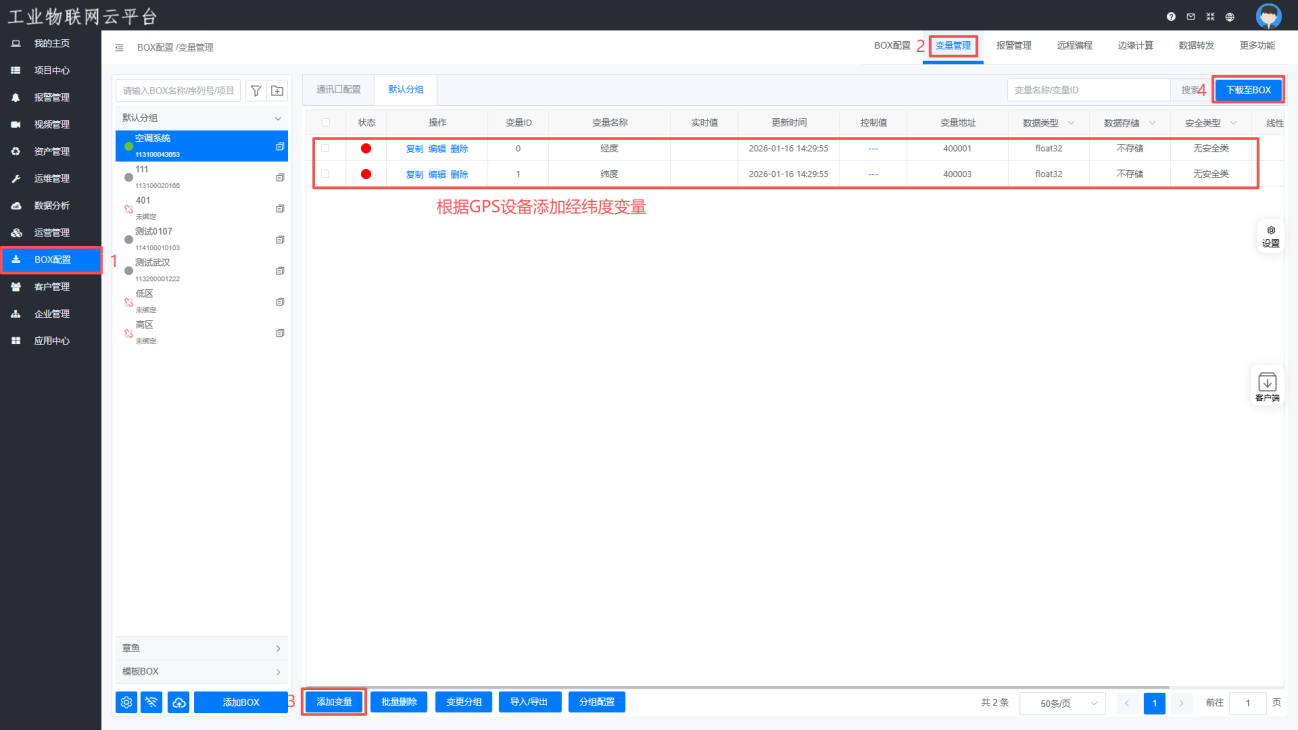 进入【BOX 管理】模块,完成经纬度变量的配置。