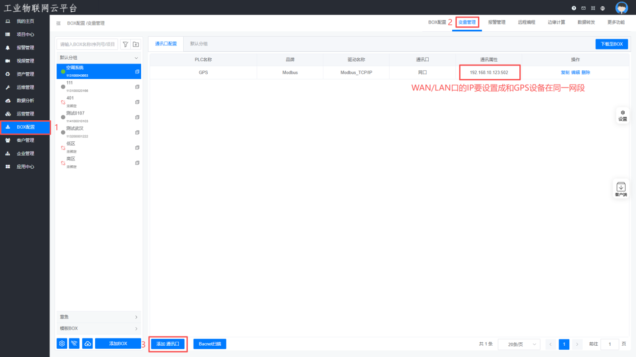 将 BOX 的 WAN/LAN 口 IP 与 GPS 设备 IP 设置为同一网段且无地址冲突;