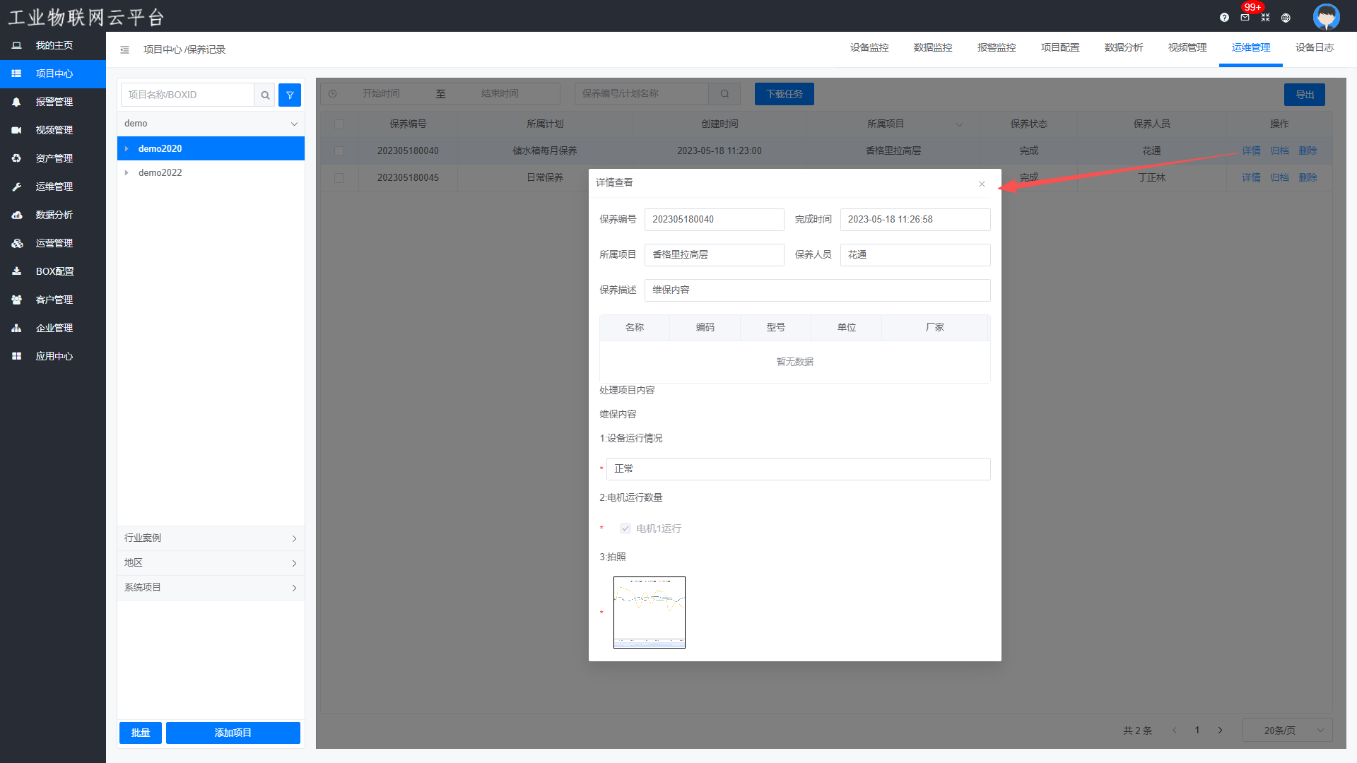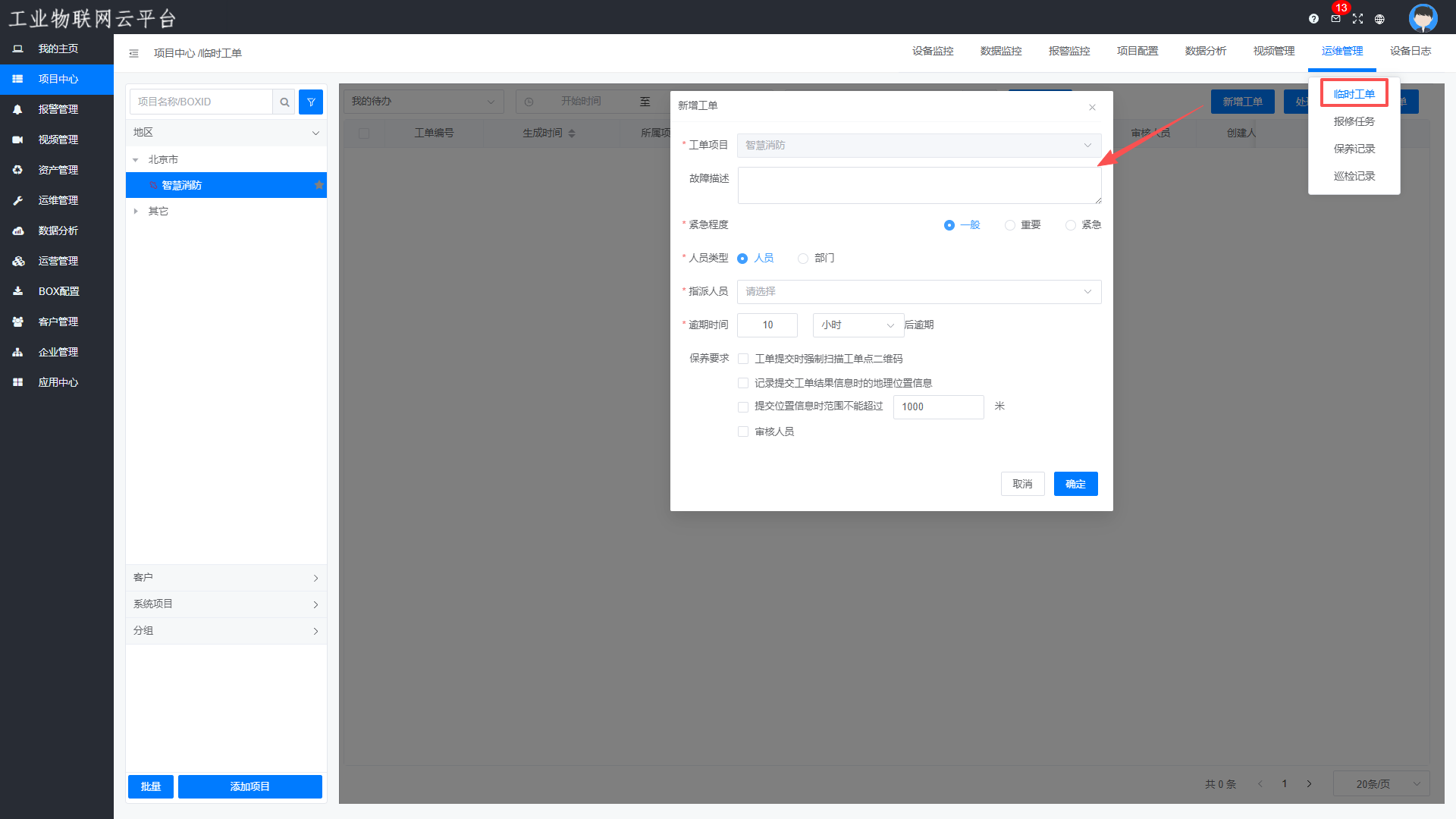 显示当前项目的临时工单、运维任务、保养记录、巡检任务等信息,只能进行工单的执行和查看,针对工单的生成、计划的添加、运维的内容录入等功能,进入左侧菜单【运维管理】进行操作;详细操作参照【运维管理】