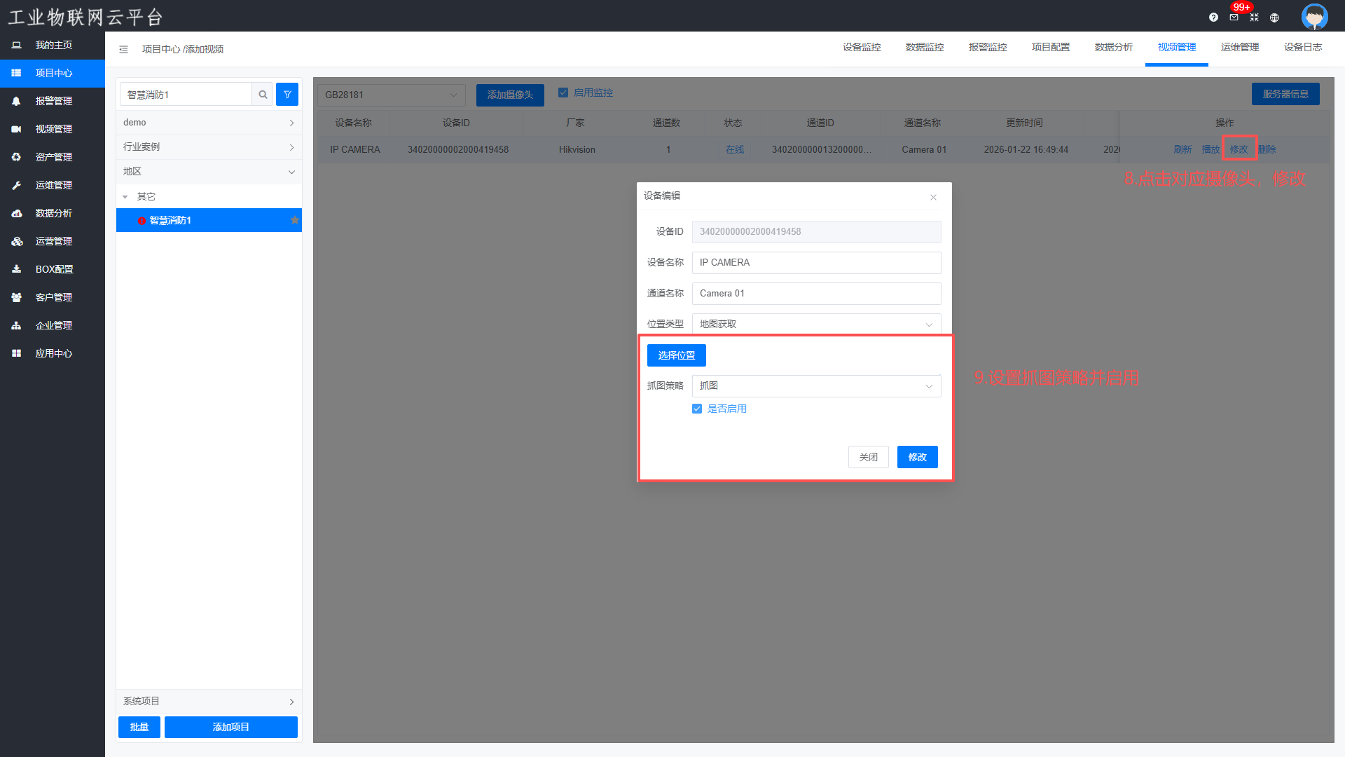 进入【项目中心】—>【添加视频】,设置直播/监控/GB28181其中一种方式勾选“启用监控”