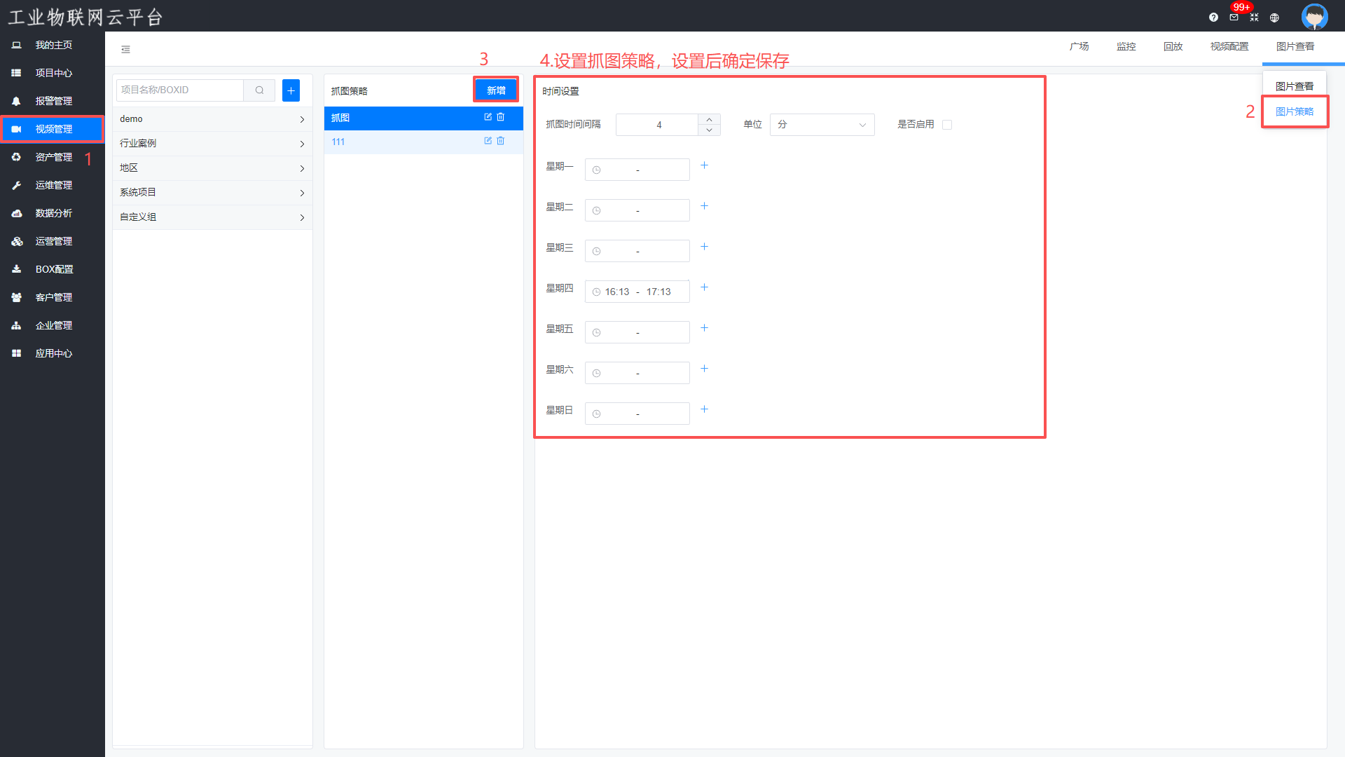 - 新增图片策略,进入【视频管理】—>【图片查看】—>【图片策略】,新建