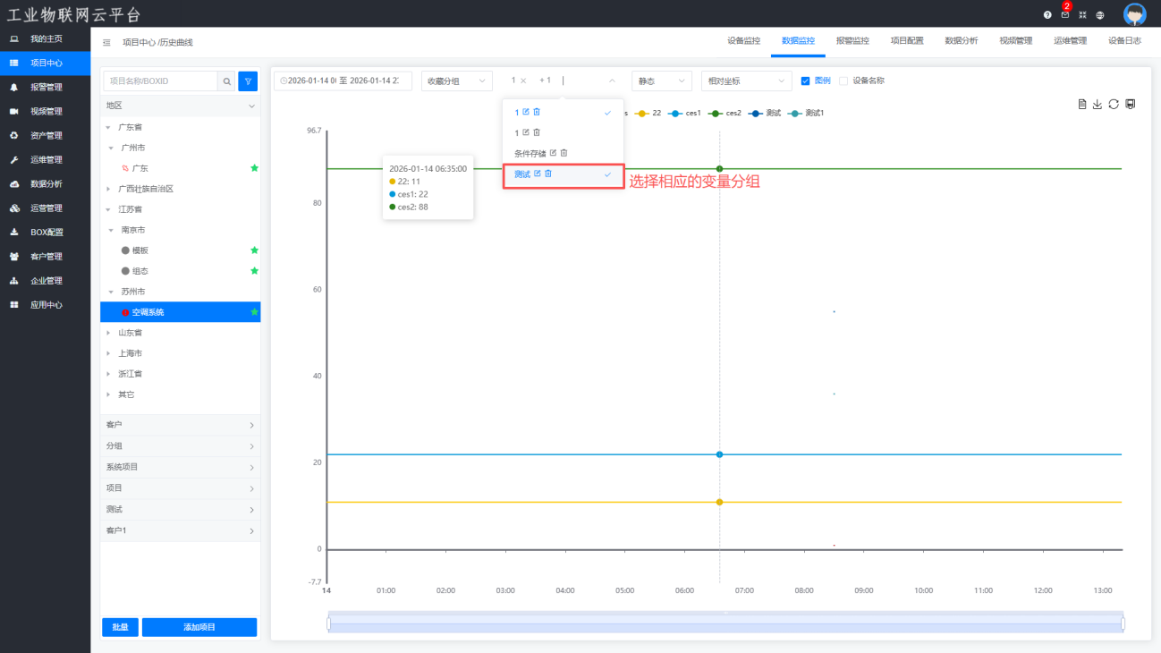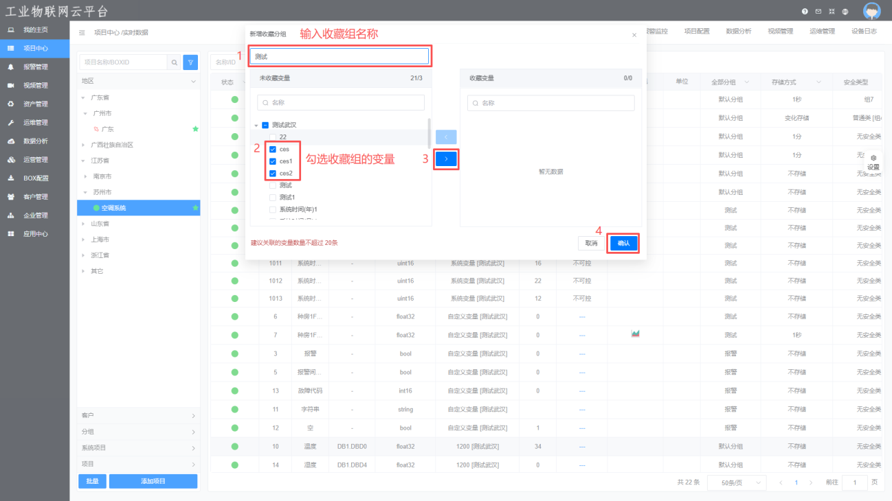 1、查看历史曲线需完成以下前置操作:先开启变量存储功能,再新建收藏组并将目标变量添加至组内,变量收藏方法详见 2.3.1 章节。