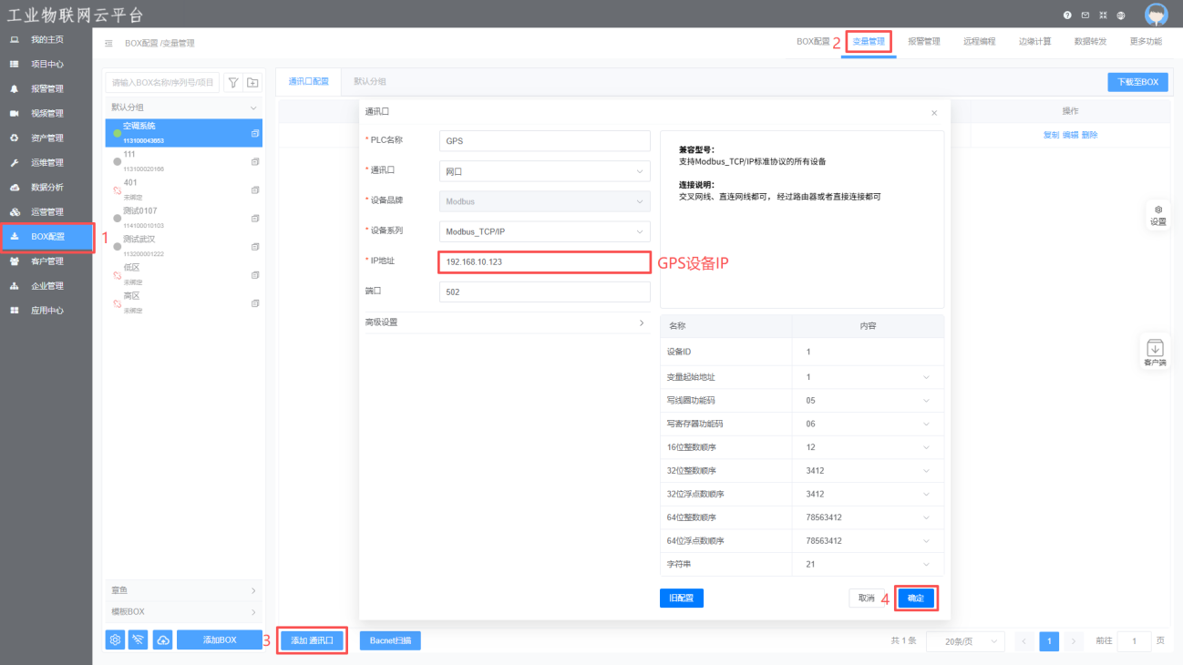- GPS 设备(需支持 Modbus 协议)接入 BOX 的 WAN 或 LAN 口时,需按以下步骤配置: