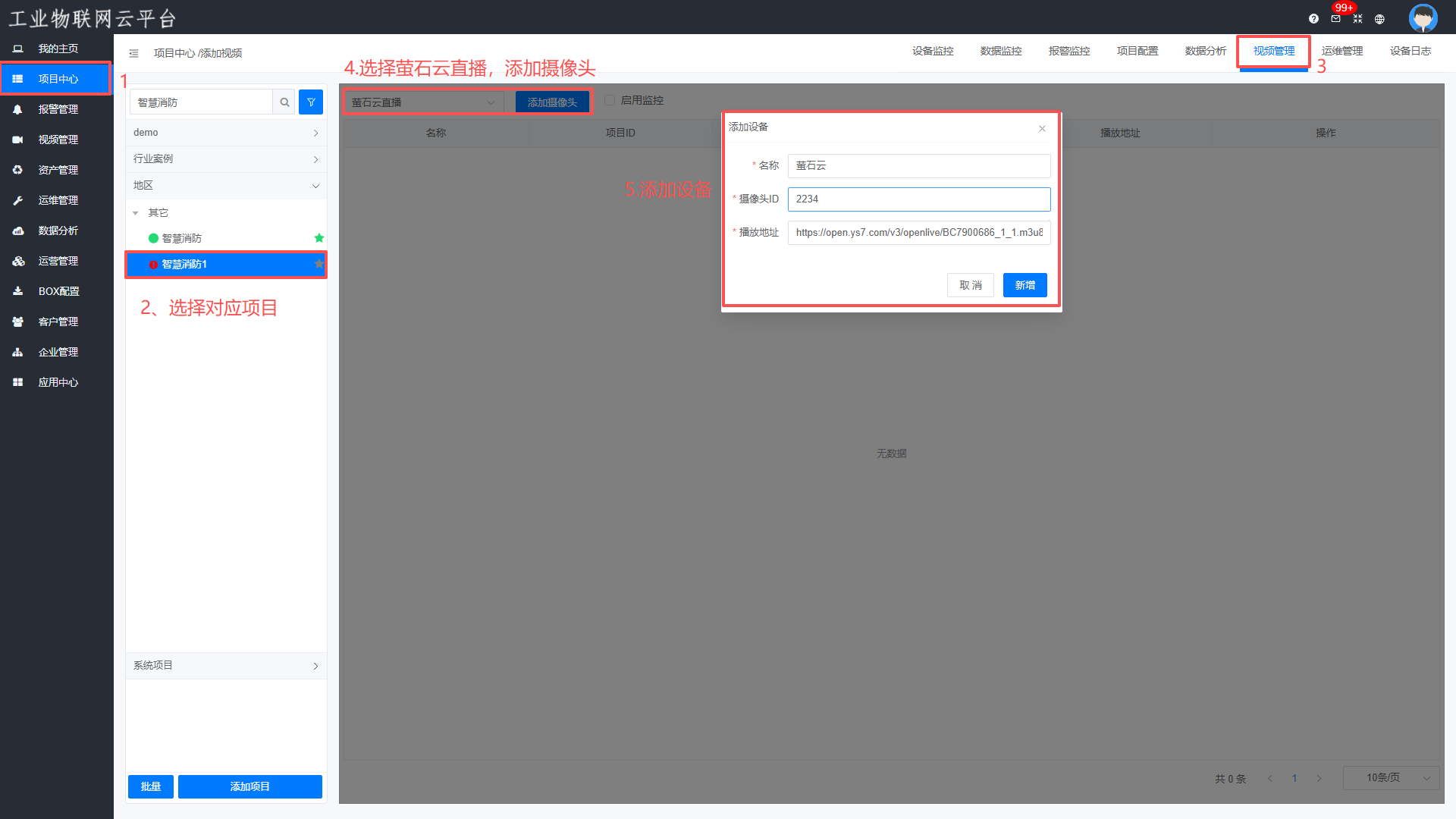 进入【项目中心】—>【视频管理】—>【添加视频】,选择“萤石云直播”,点击“添加摄像头”