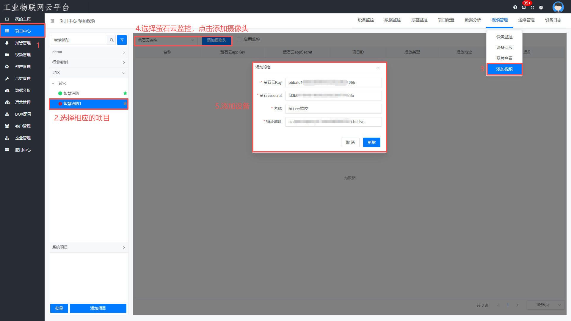 进入【项目中心】—>【视频管理】—>【添加视频】,选择“萤石云监控”,点击“添加摄像头”
