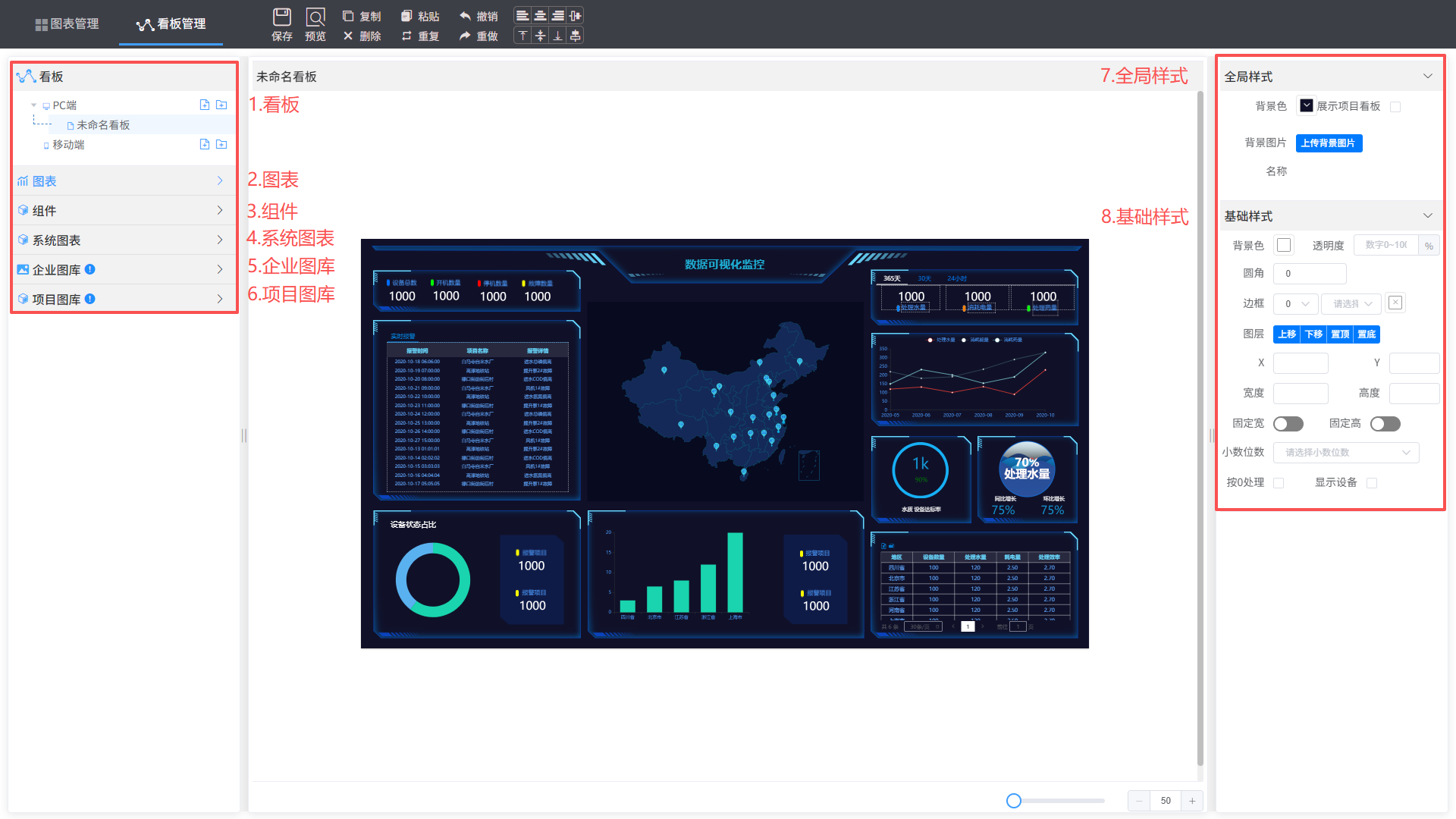 (7)全局样式:右方的属性框可以上传看板背景图片、设置背景颜色以及设置是否在数据分析-报表监控中展示该项目看板