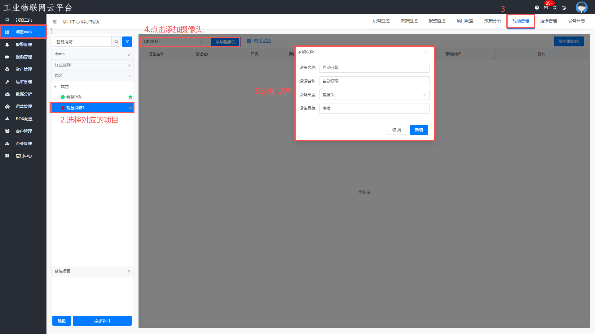 - 进入【项目中心】—>【视频管理】—>【添加视频】,选择“GB28181”,点“添加摄像头”