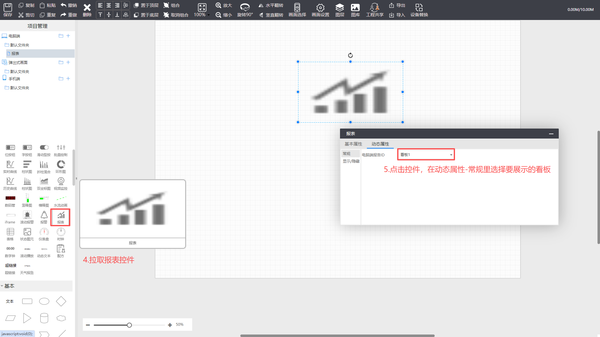 项目中心—>编辑组态—>报表控件,选择对应的看板,然后保存查看