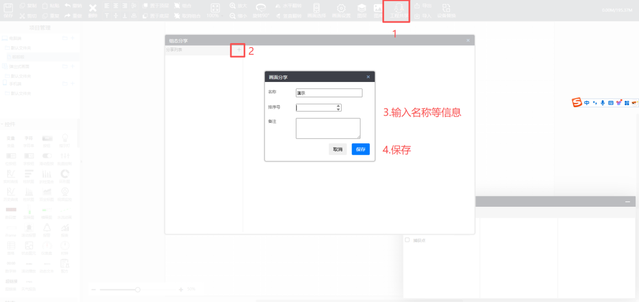 操作方法:(1)进入【项目中心】—>【设备监控】,选择编辑组态,点击“工程共享”,在弹出的页面点击分享列表后的+,输入名称等信息后保存,在分享列表下面会添加一条分享信息