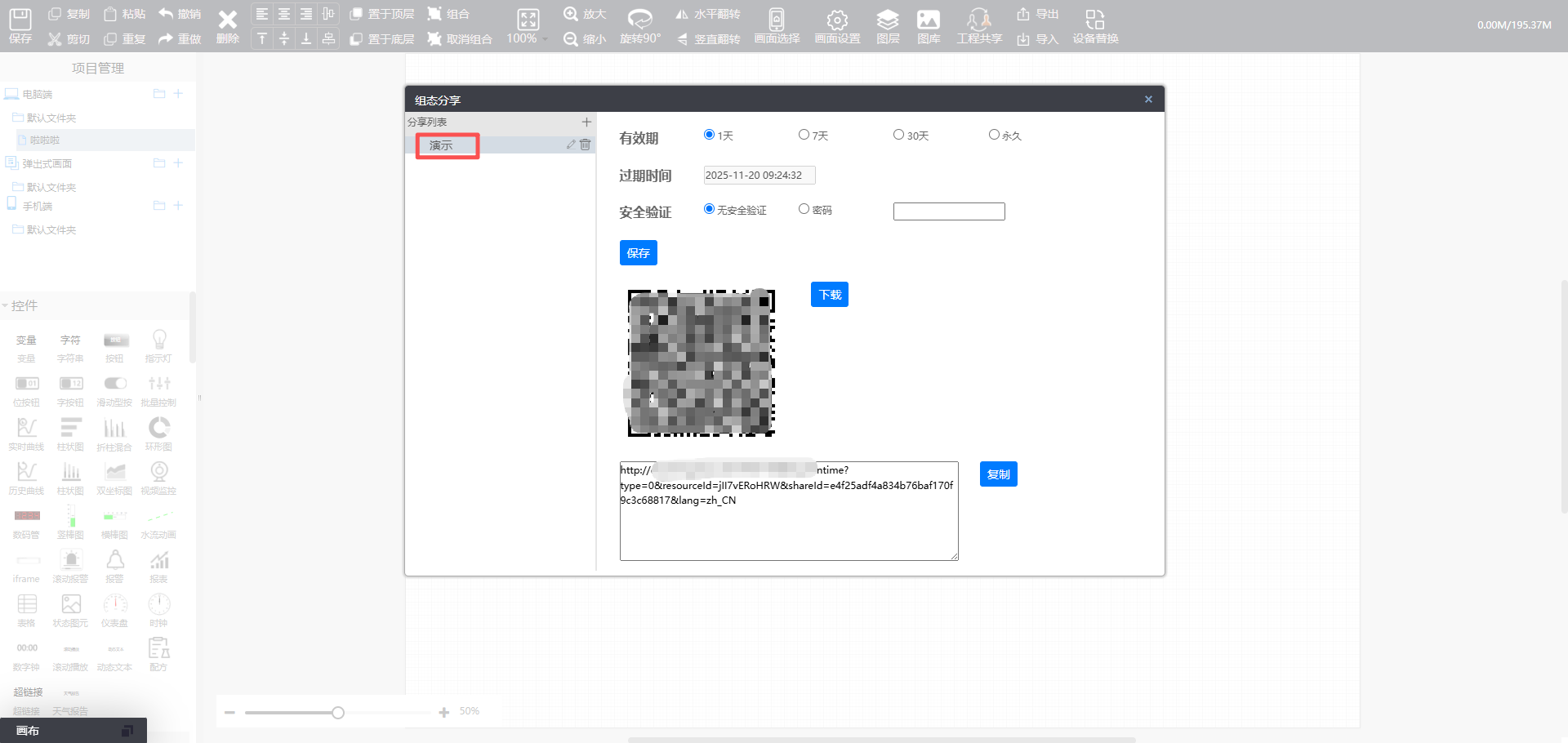 功能:工程画面以链接或者二维码的方式分享给用户,用户只需要扫描二维码或者输入链接即可访问工程组态