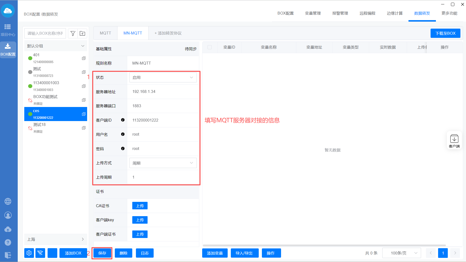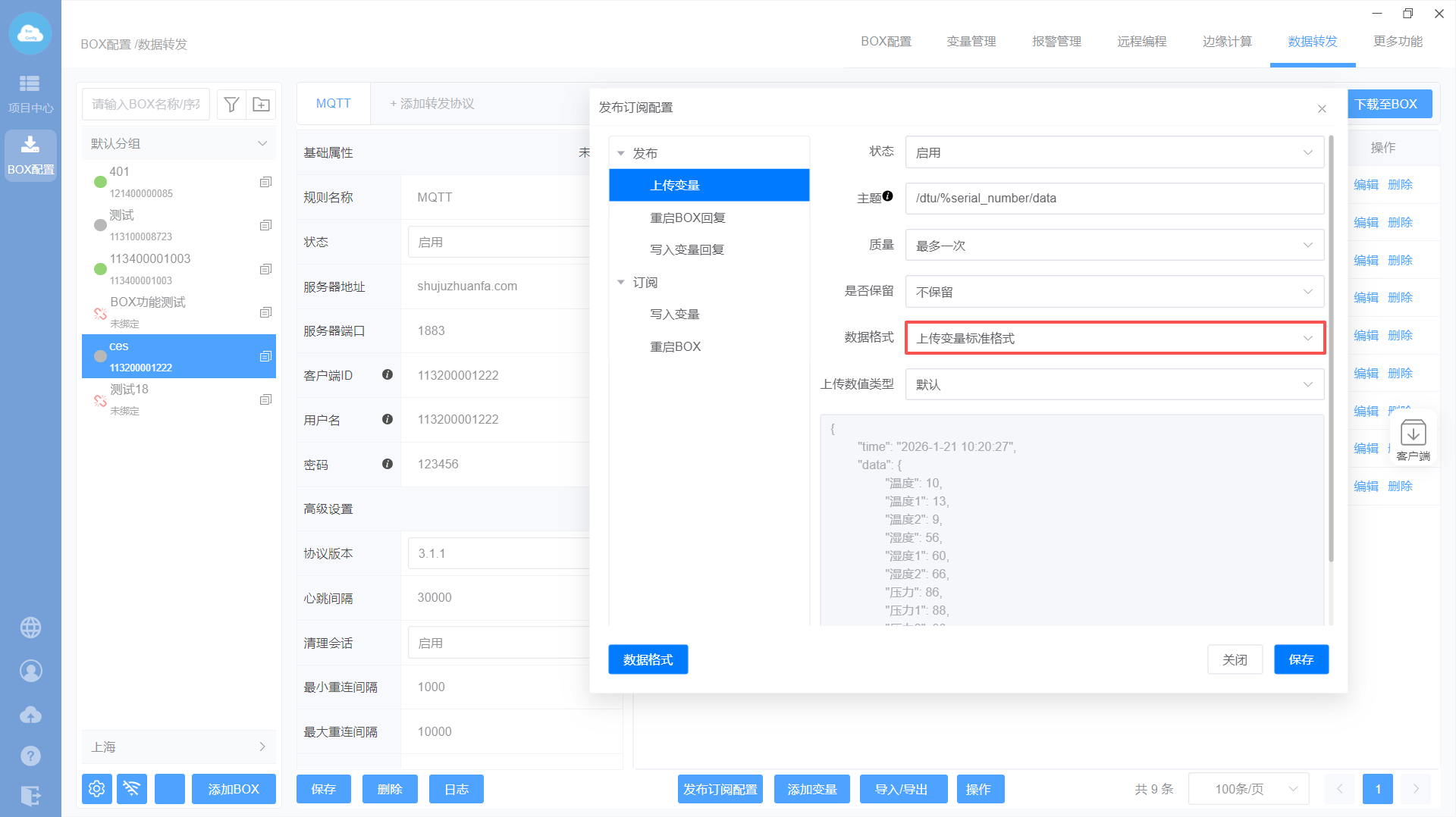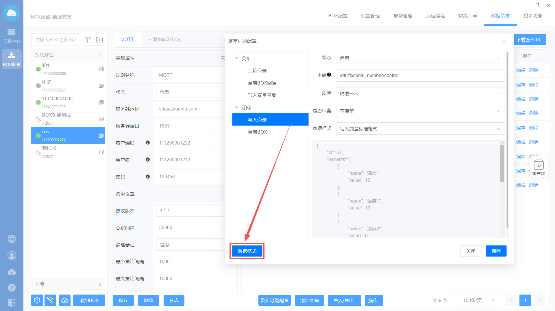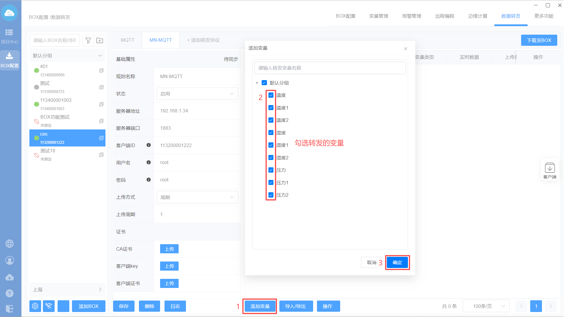 添加MQTT转发协议—>设置转发基础属性—>添加转发变量—>下载至BOX