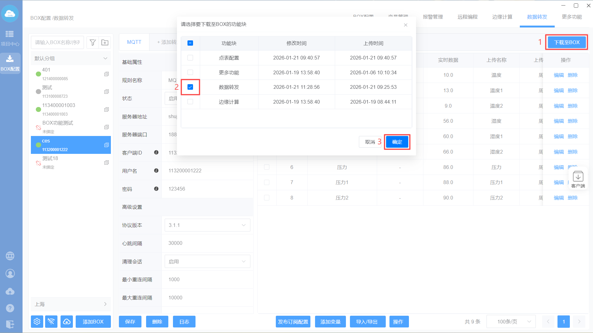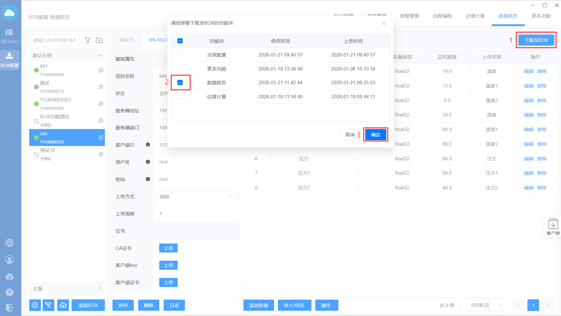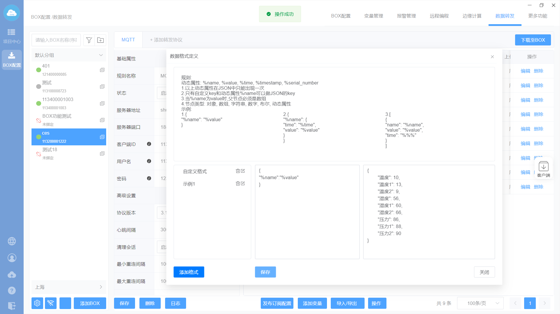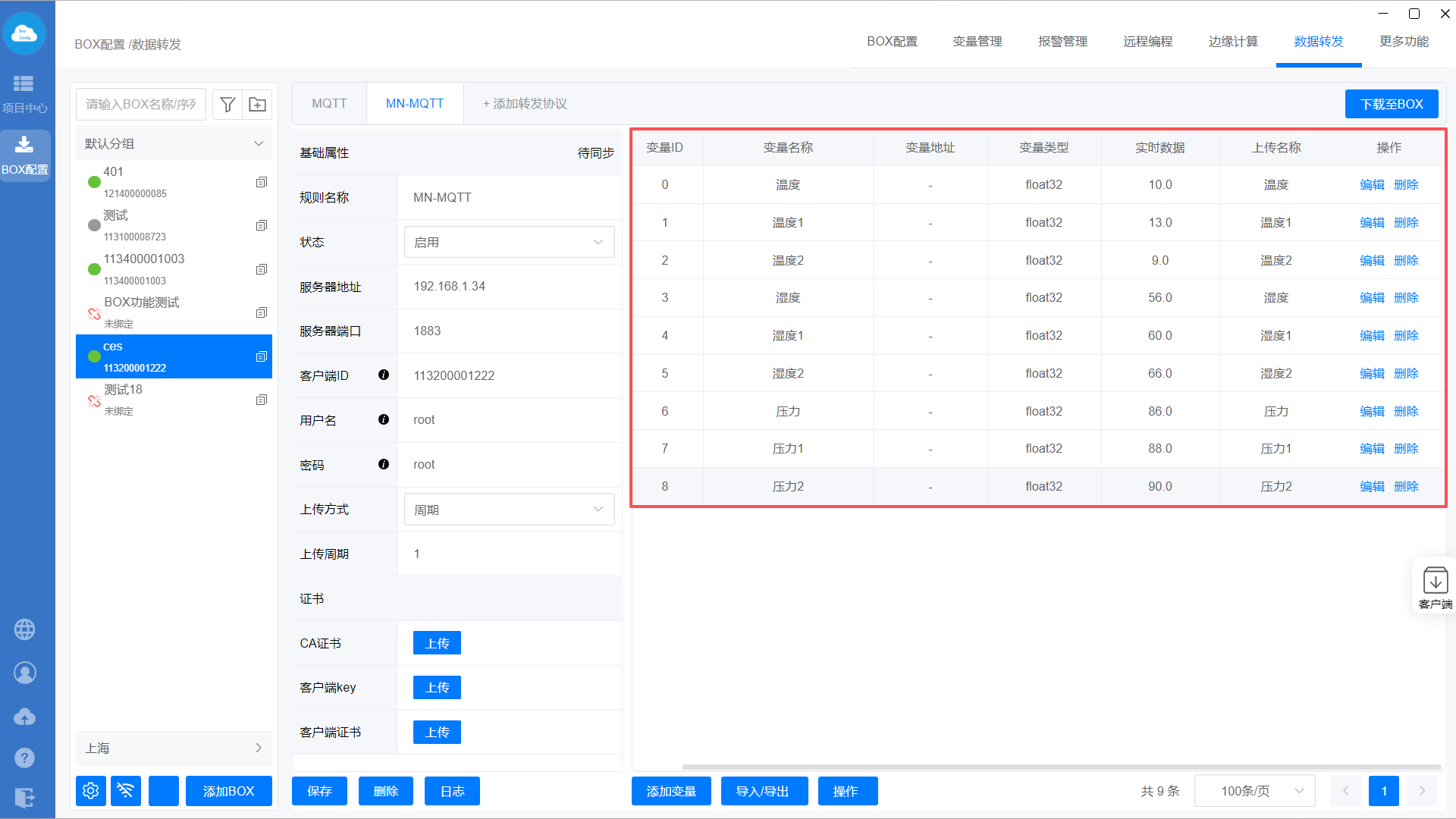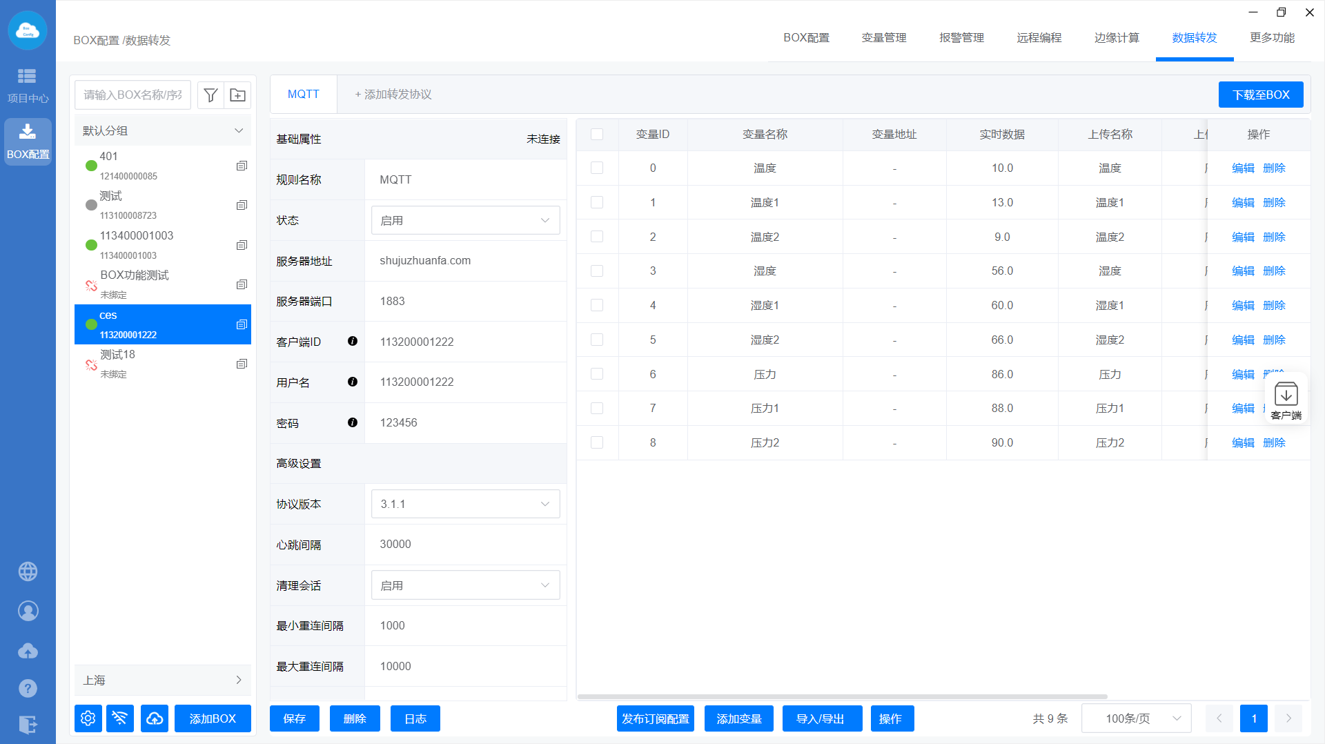 添加MQTT转发协议—>设置转发基础属性—>添加转发变量—>下载至BOX