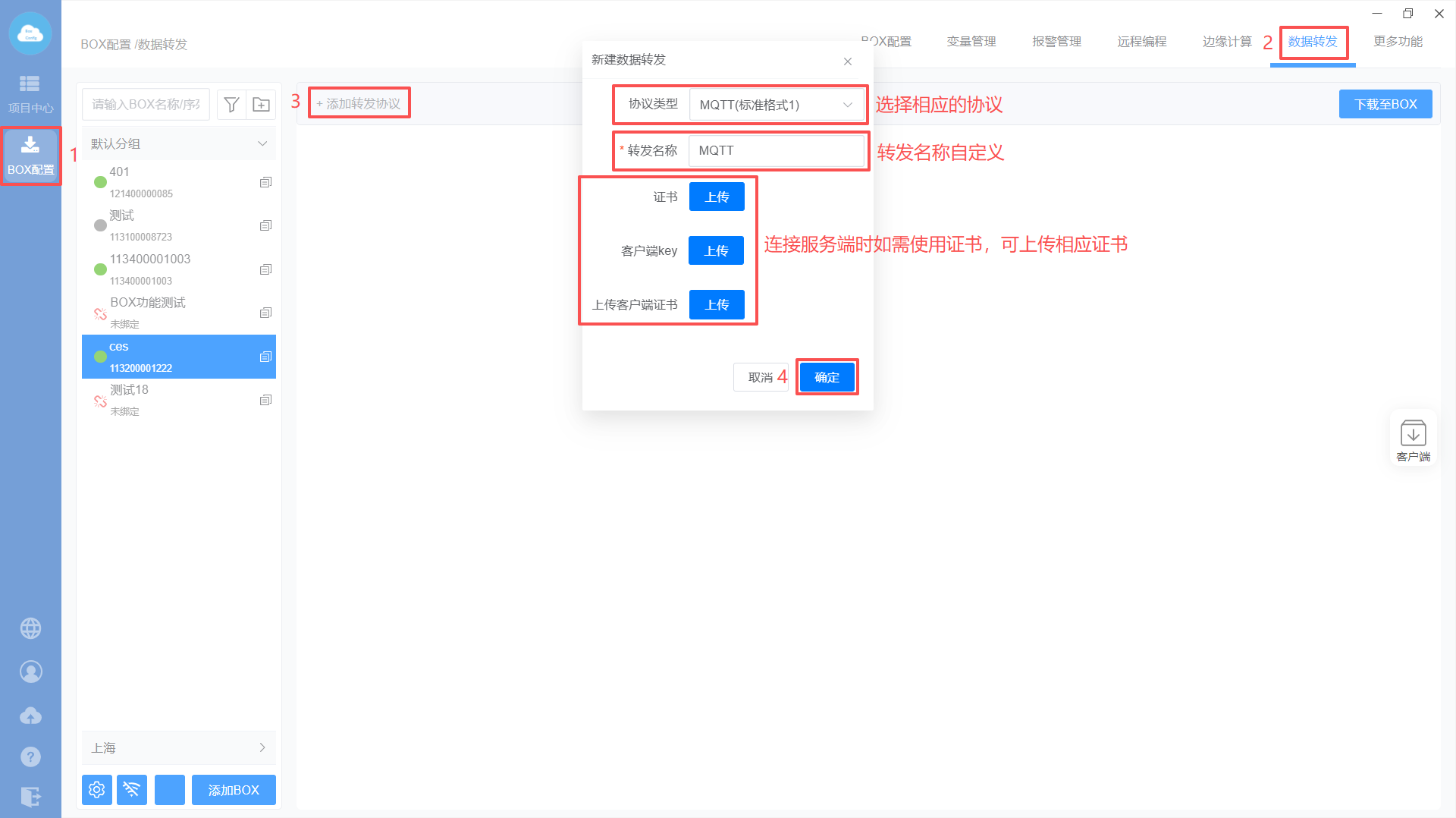 进入【BOX配置】选择对应的BOX—>点击【数据转发】,点击“添加转发协议”,在弹出窗口中协议类型选择“MQTT(标准格式1)”,转发名称自定义,然后点击“确定”