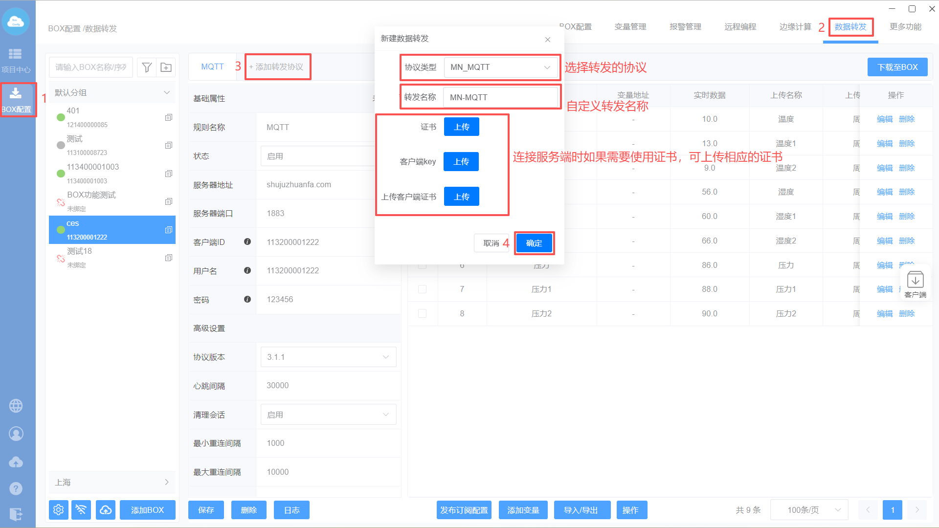 进入【BOX配置】选择对应的BOX—>点击【数据转发】,点击“添加转发协议”,在弹出窗口中协议类型选择“MN_MQTT”,转发名称自定义,然后点击“确定”