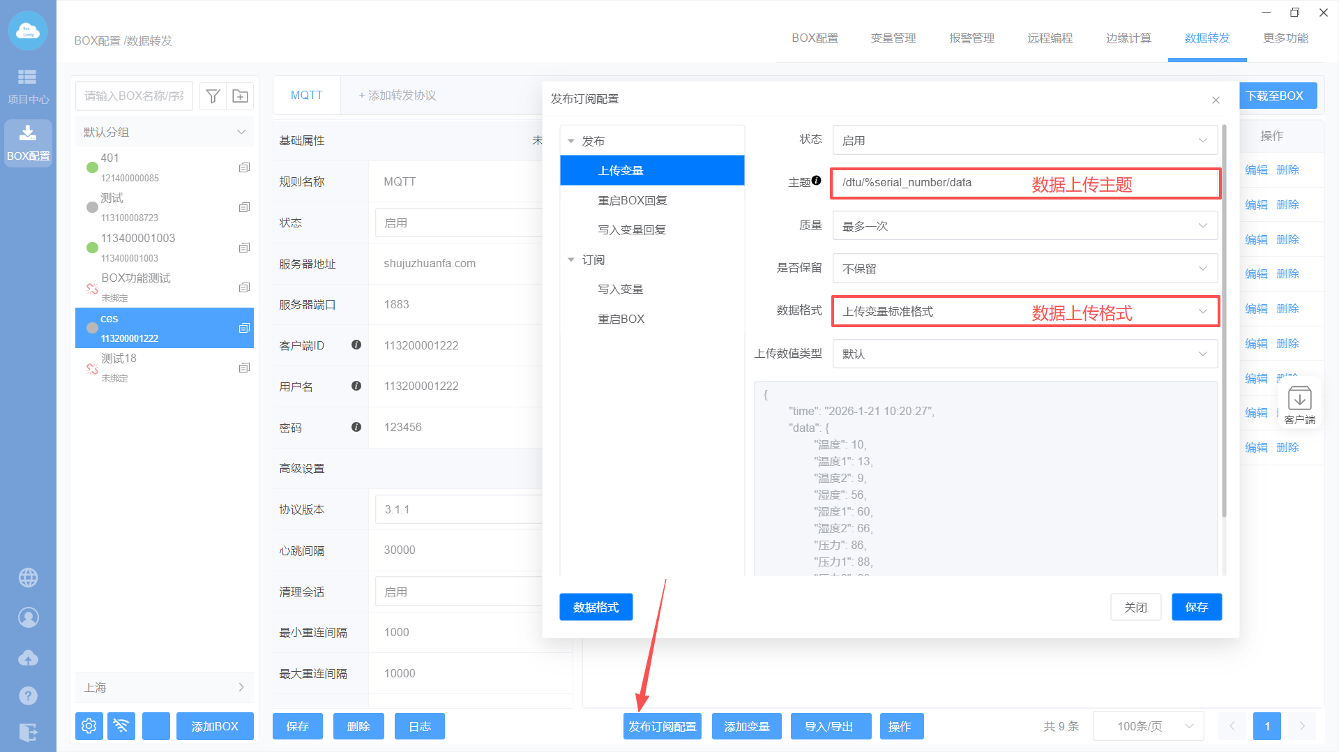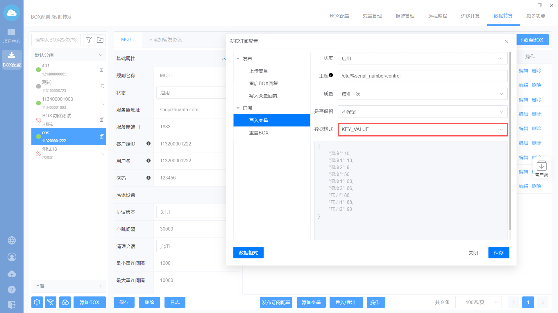 添加MQTT转发协议—>设置转发基础属性—>添加转发变量—>发布订阅配置—>下载至BOX