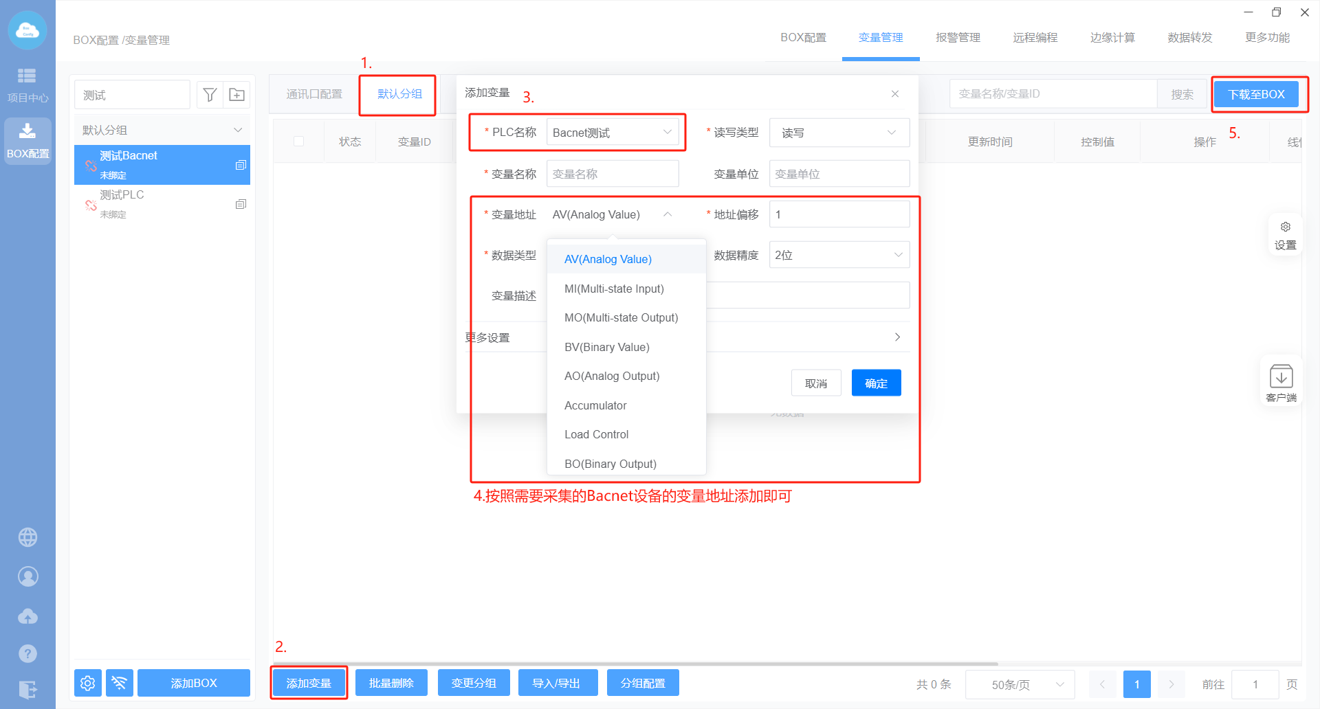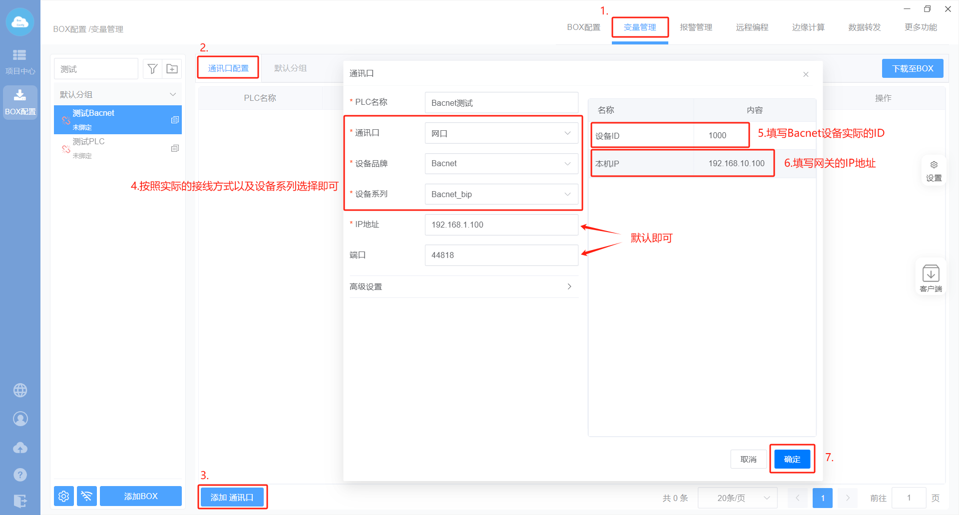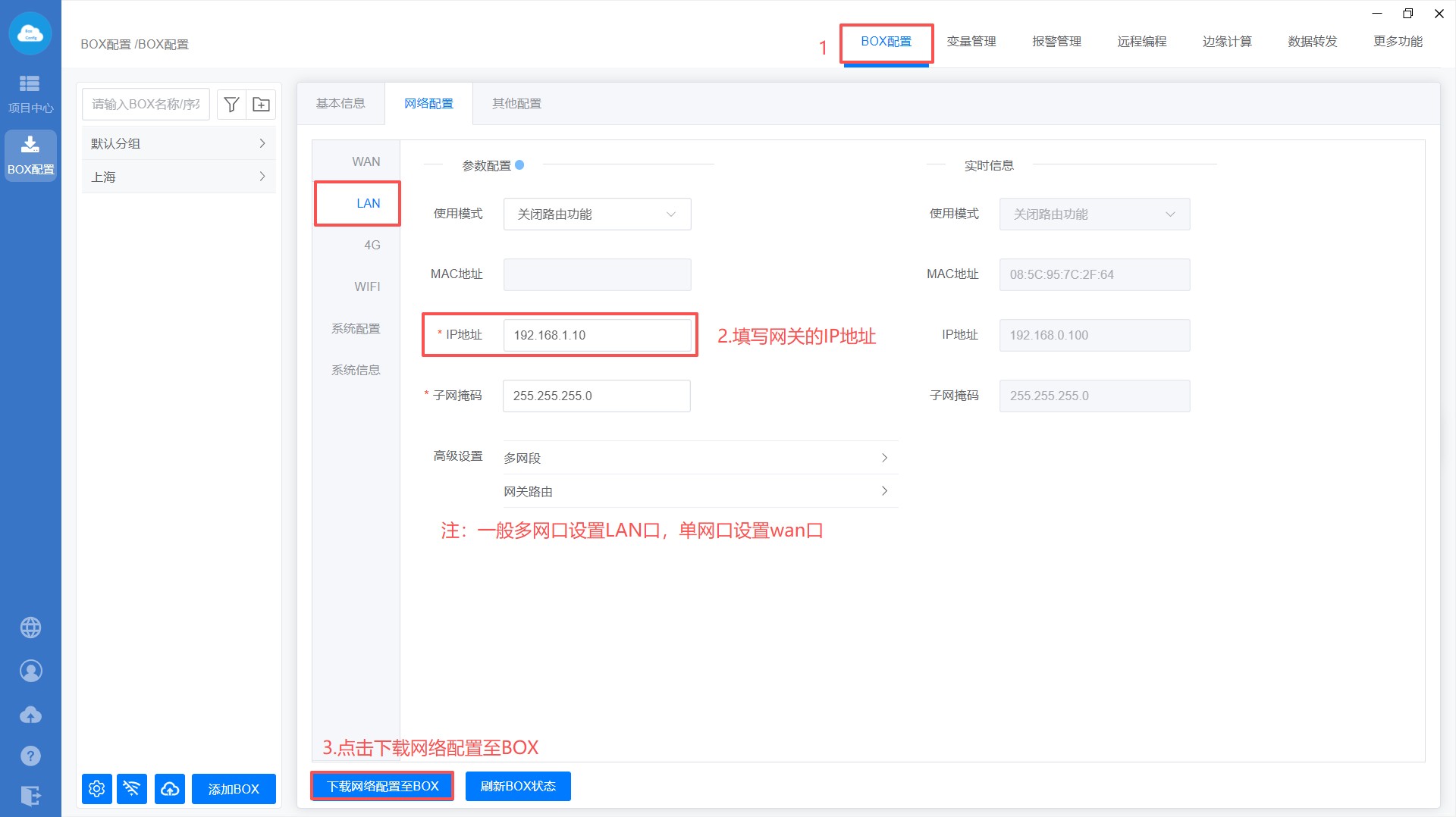 1、BOX配置(注意:网关的IP地址要和Bacnet设备IP地址保持在同一网段且不冲突)