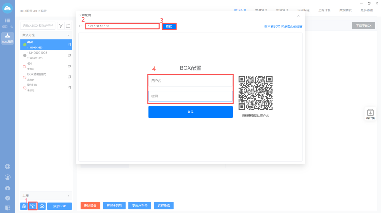 2、在弹出的页面输入BOX IP地址,点击“连接”,输入账户密码后进入BOX配置页面。