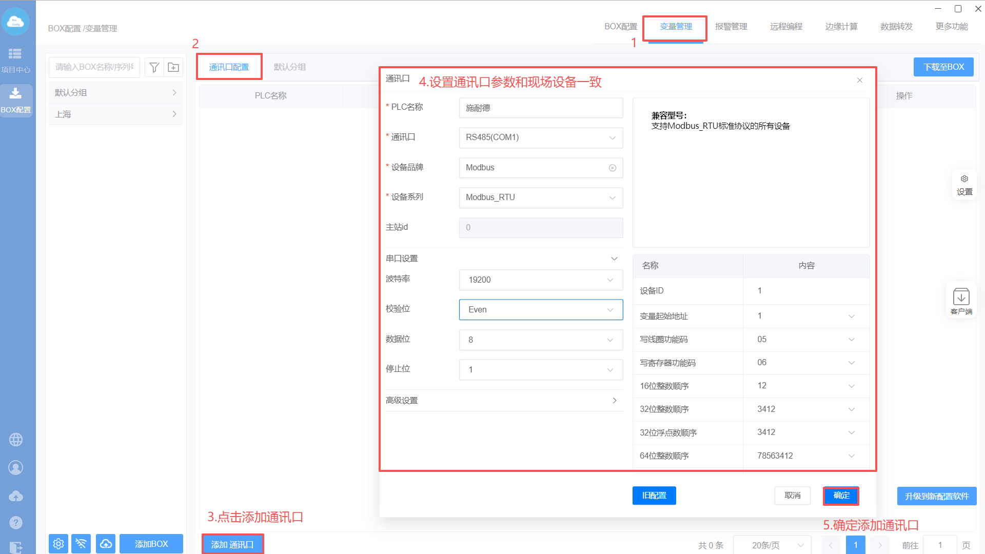 - 设置BOX串口参数(和PLC设置保持一致)