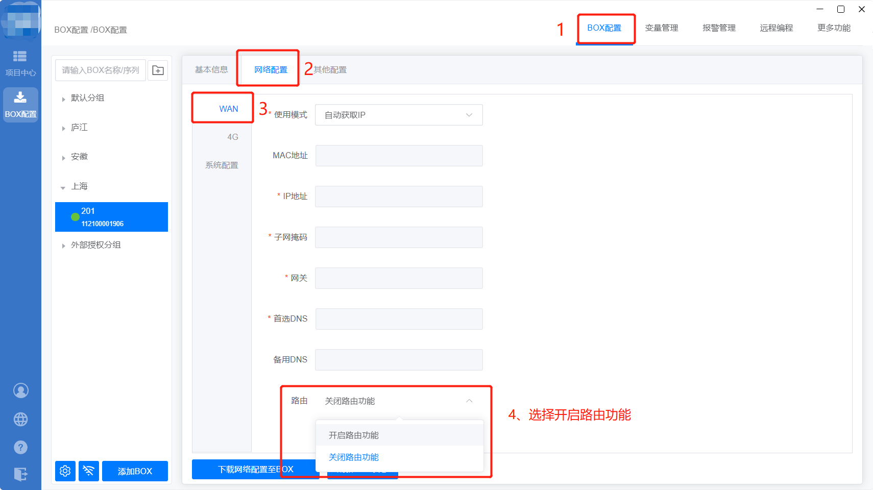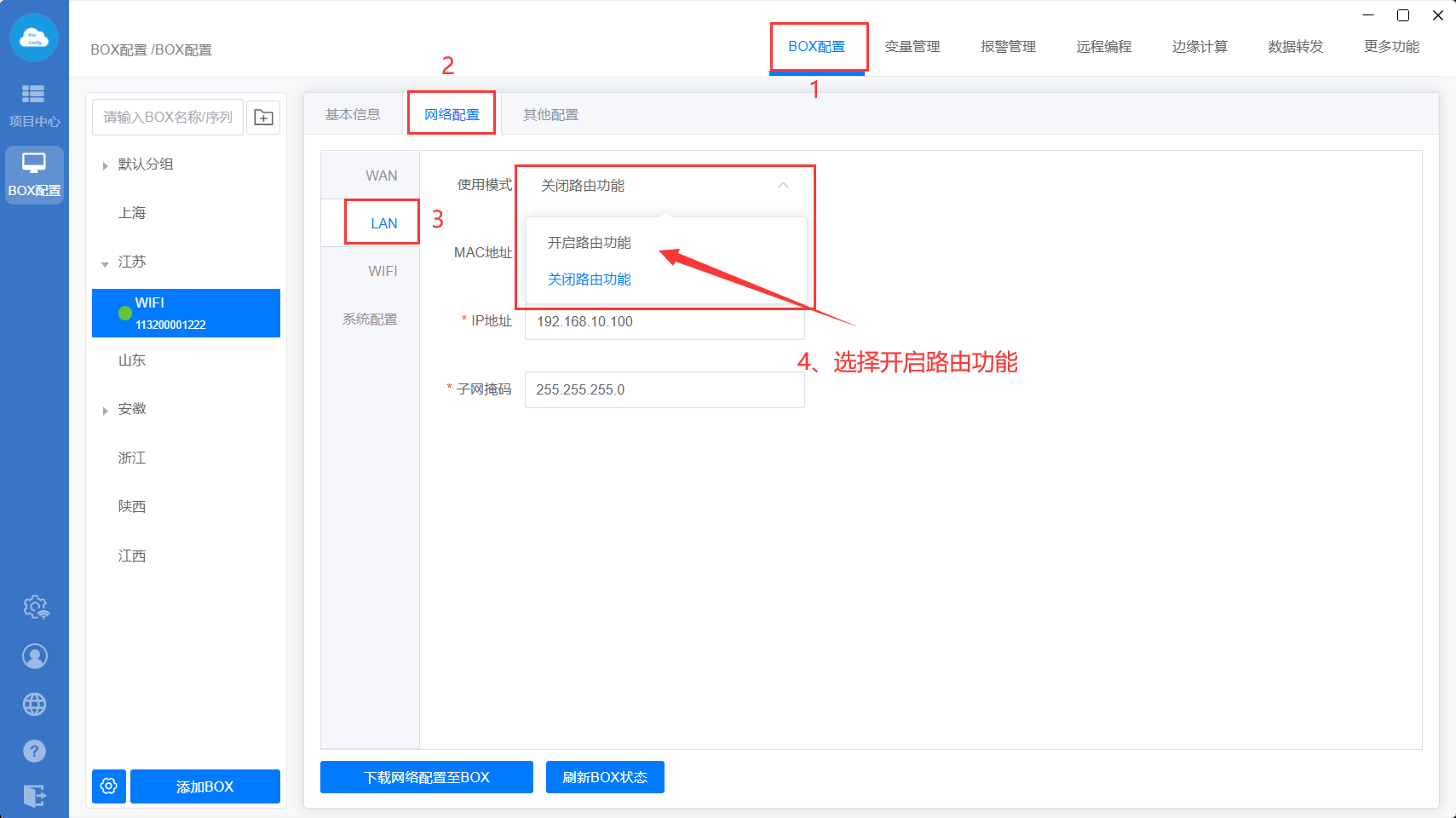 功能说明:盒子使用4G/WiFi/以太网方式上网,选择此项,具备路由功能,可通过LAN口给其他设备(比如电脑)提供网络。