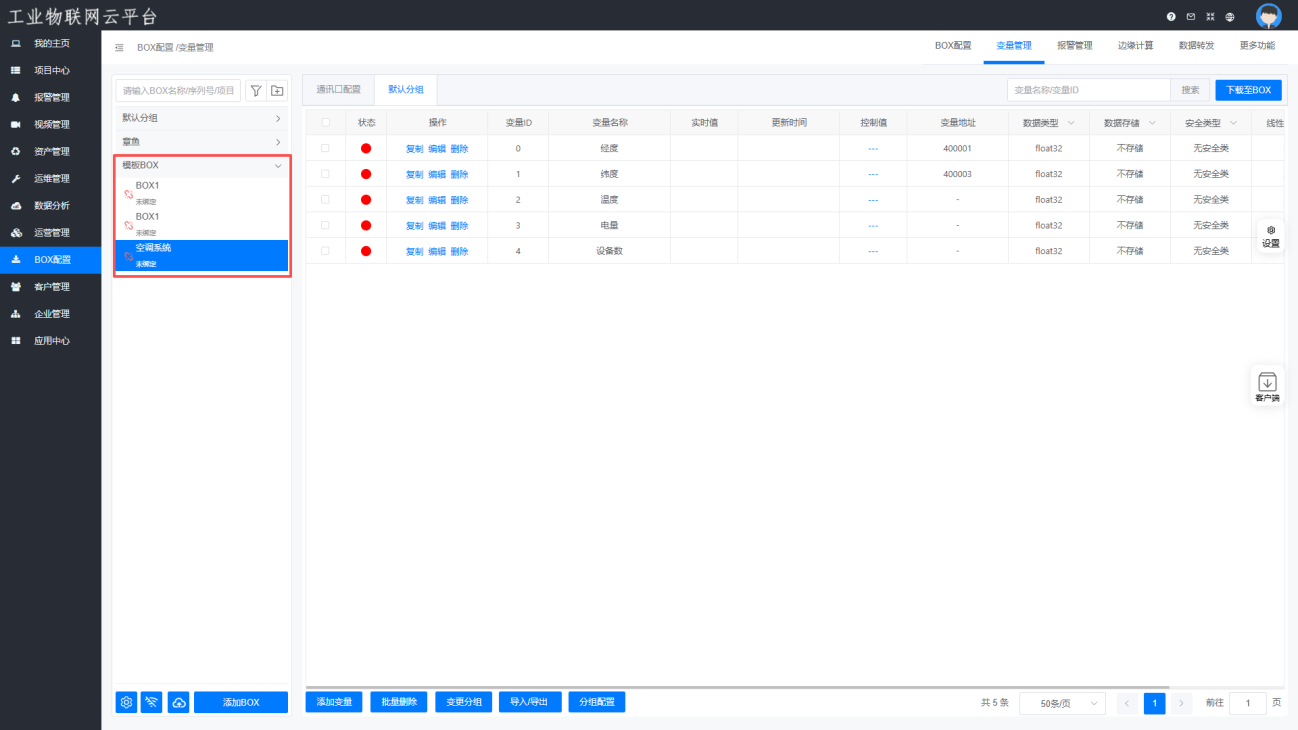 进入【BOX 配置】模块,找到模板对应的 BOX 分组,选中目标 BOX 即可执行修改操作。