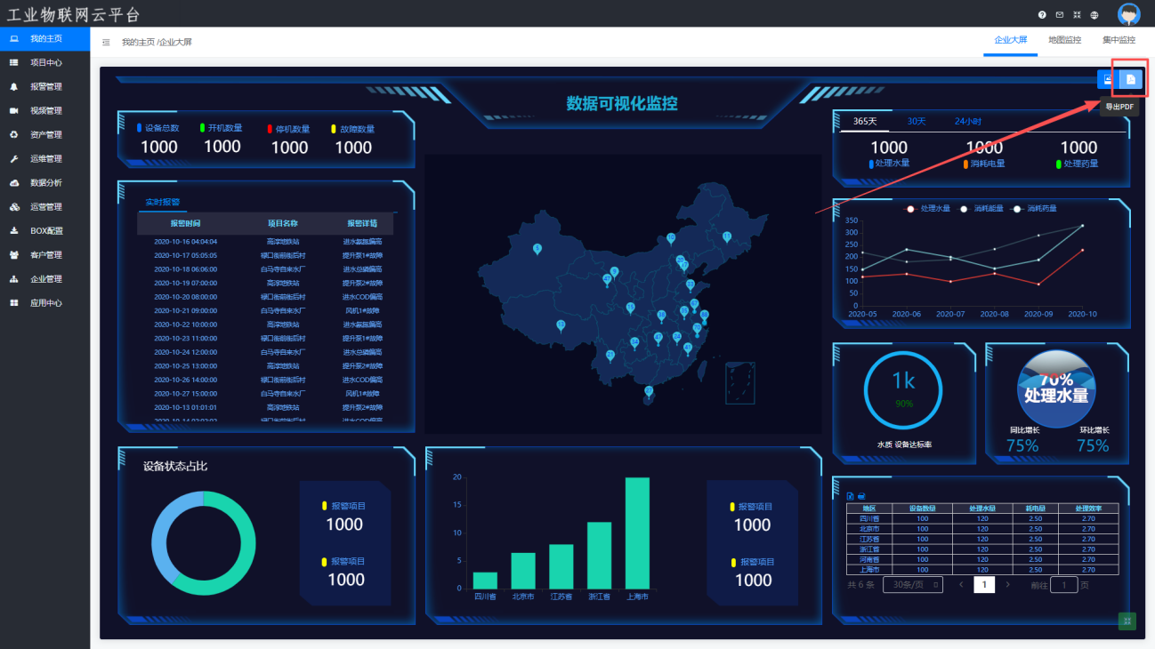 已完成配置的数据分析看板,可设置在企业大屏展示;同时支持将看板导出为图片或 PDF 格式。