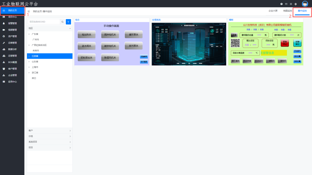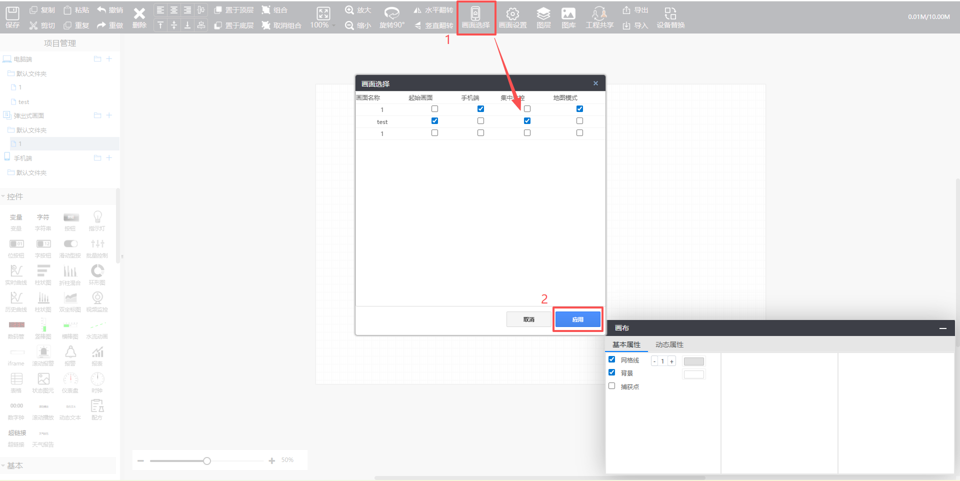 集中监控开启步骤:依次点击【项目中心】—>【设备监控】—>【编辑组态】,进入组态编辑页面,点击【画面选择】勾选需要集中监控的画面即可。