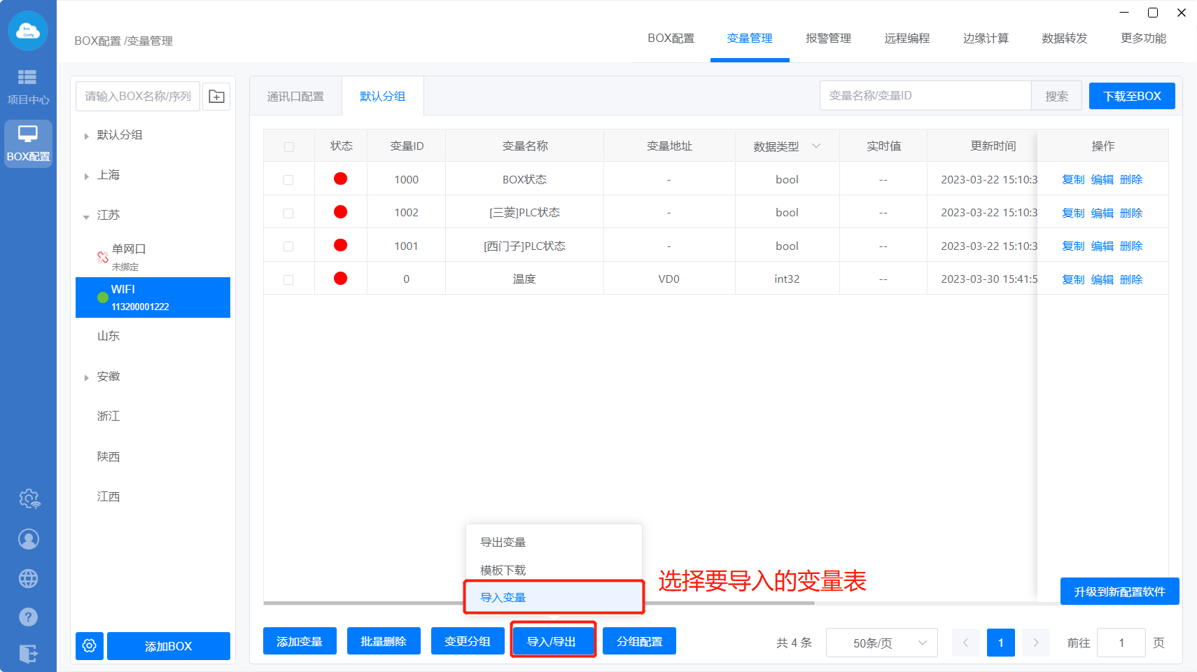 选中BOX,点击“导入/导出”选择导出变量,会弹出对应的框。