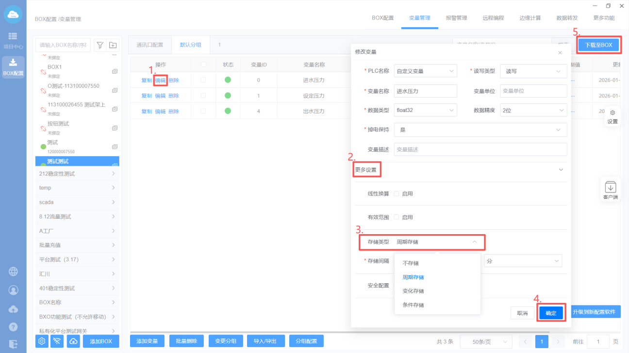 1、配置工具【BOX配置】-【变量管理】中对变量配置存储,并下载到BOX;