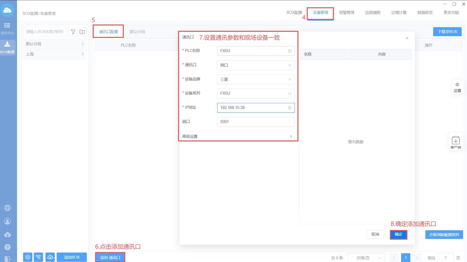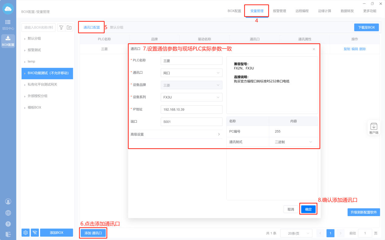 - Box设置(注意:修改box参数,与PLC保持在同一网段)