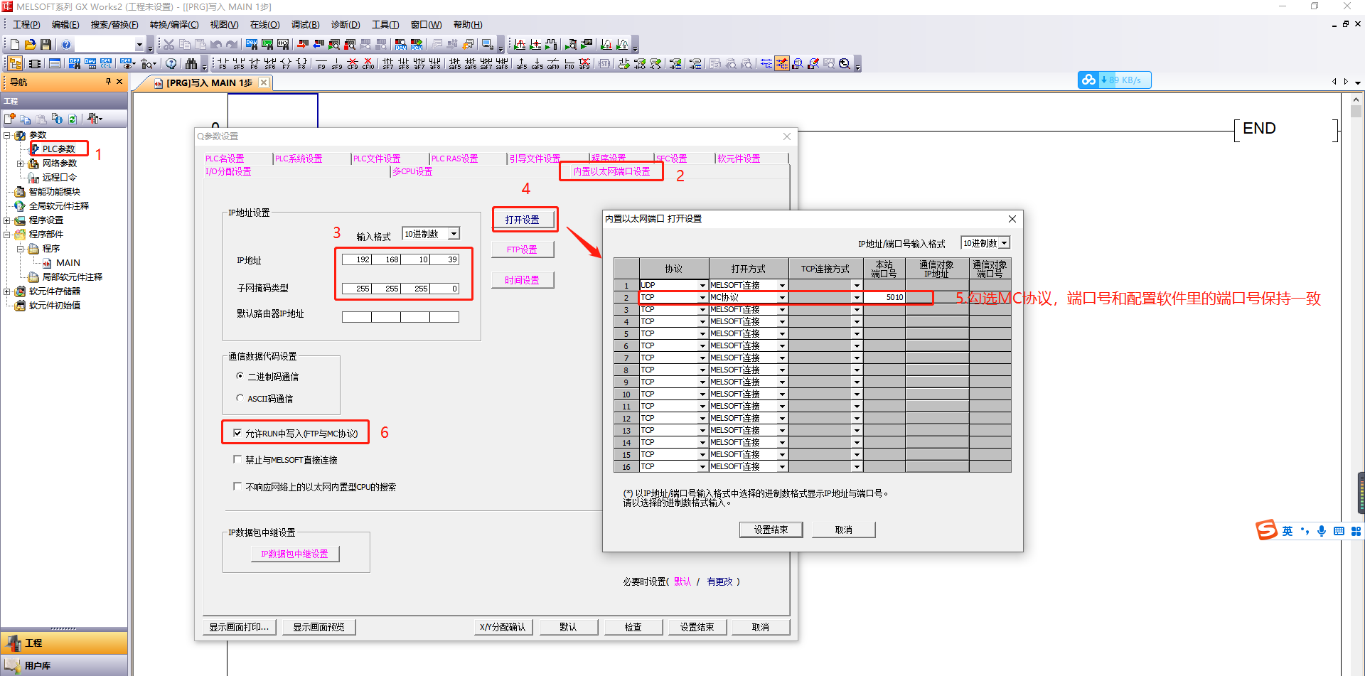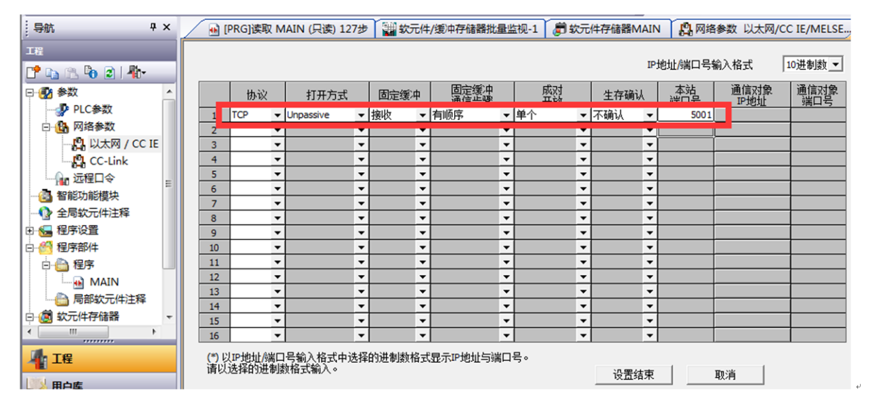 2.设置MC协议,端口号与配置软件里保持一致;