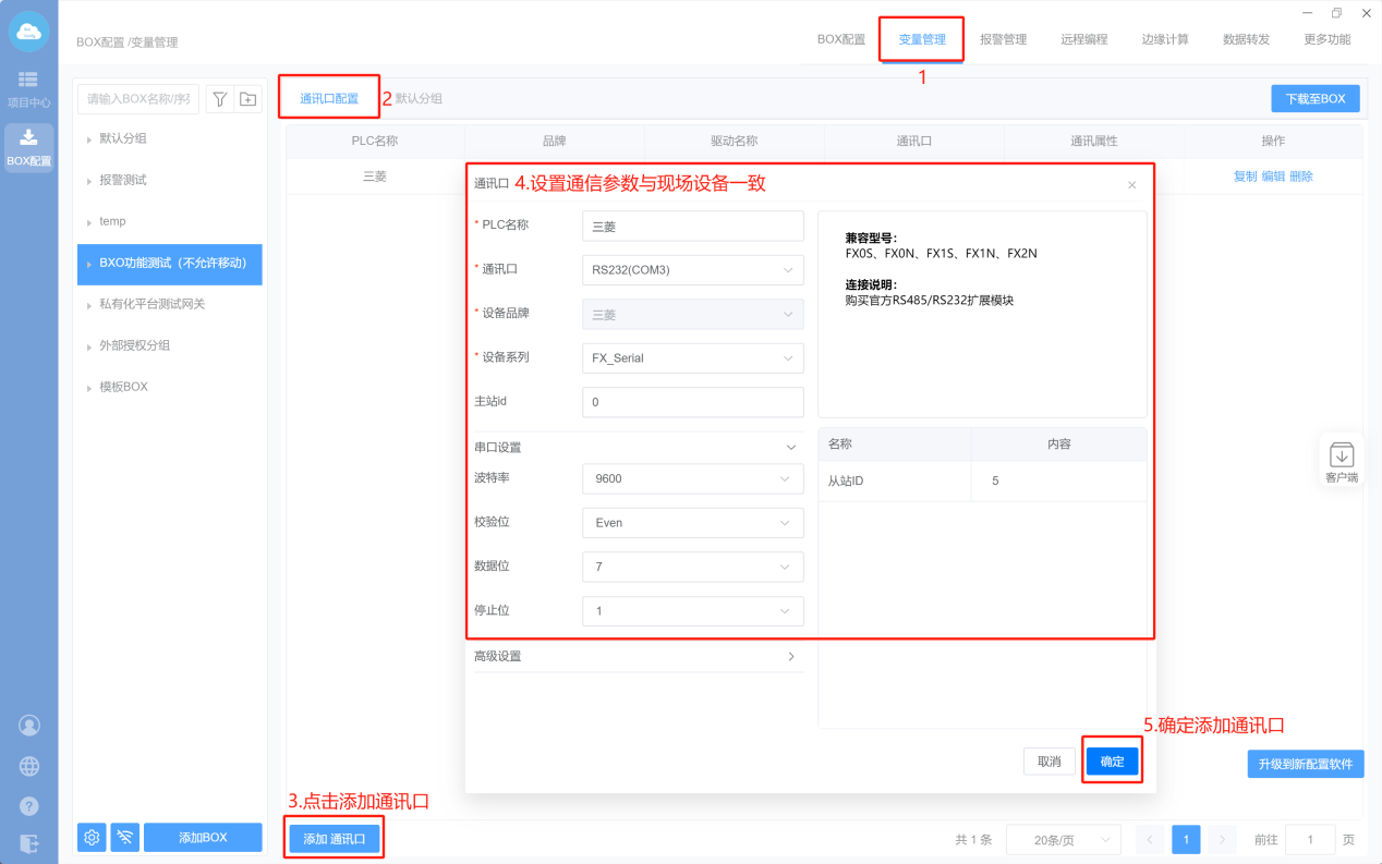 - Box配置(主站ID不需要填写,默认即可;波特率保持默认)