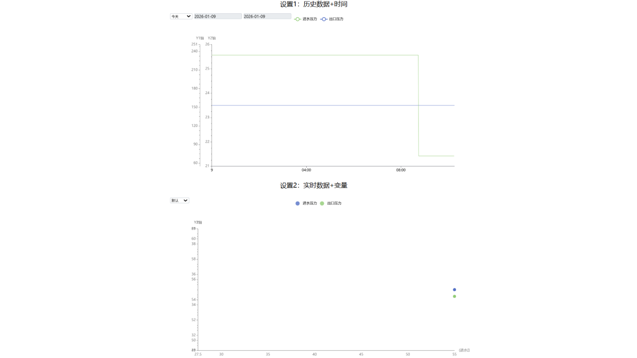 变量::X轴和Y轴都是变量值,注意:数据的图表类型必须是散点图,否则不显示。实时数据和历史数据都支持散点图功能;