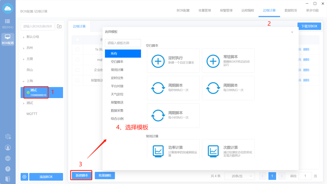 操作方法:新建脚本—>选择模板—>编辑脚本并保存—>下载到BOX