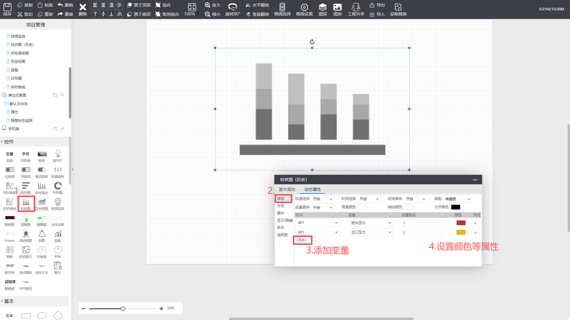 变量图例:是否显示图例,图例为曲线名称,图例颜色和曲线颜色一致;在运行态可点击图例显示隐藏曲线