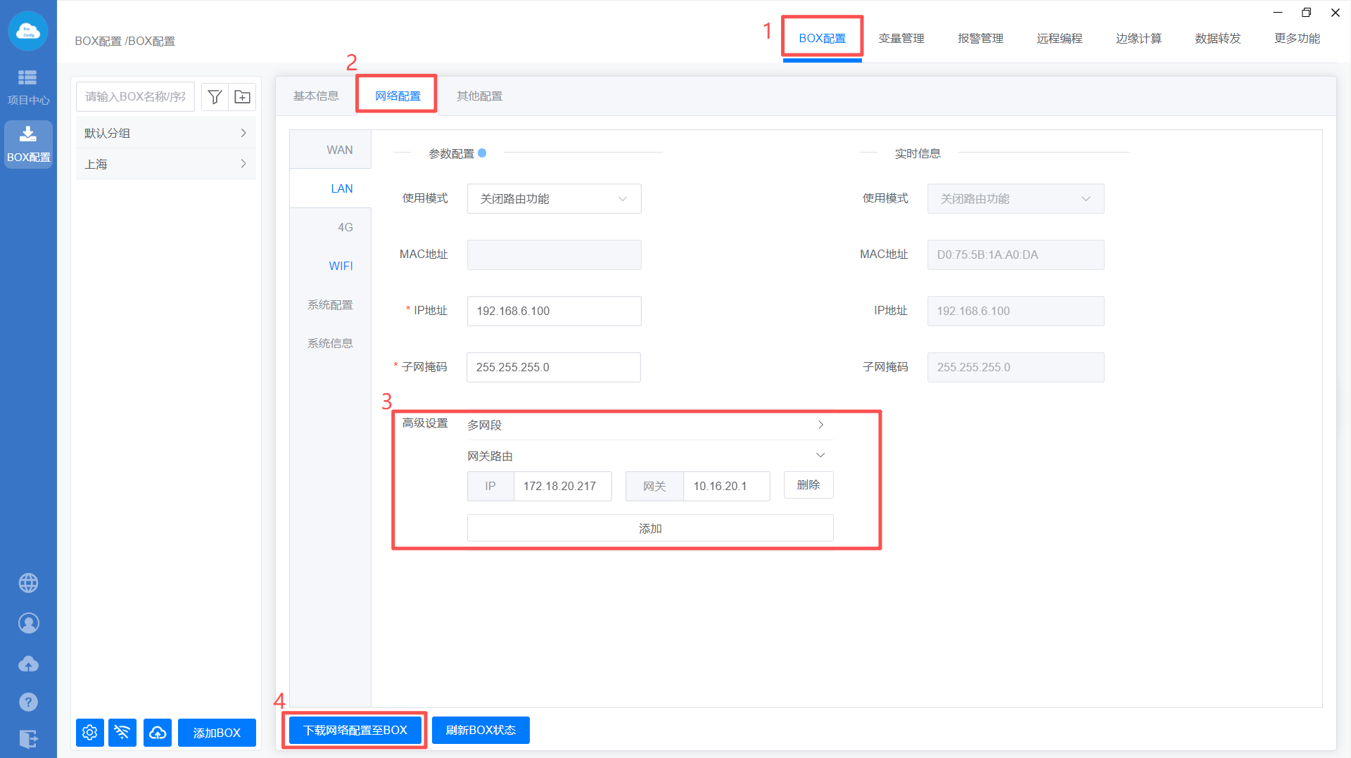 设备进行通讯的时候,设备端需要设置网关的IP后才允许访问。如需与最终设备(172.18.20.217)进行通讯,但因现场无法直接访问目标设备,所以需要在【BOX配置】-【网络配置】添加可访问的网关,从而实现网关与目标设备通讯。
