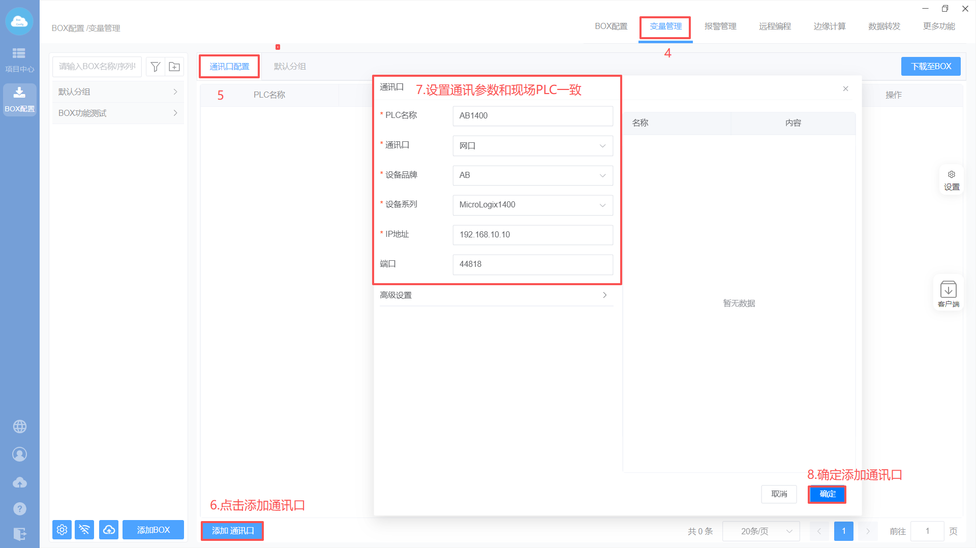 - Box设置(注意:修改box参数,与PLC保持在同一网段)
