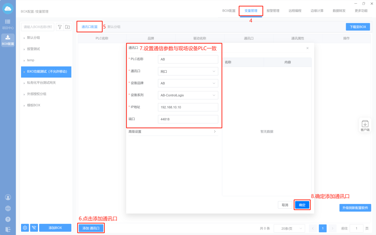 添加通讯口,设备品牌、协议IP地址PLC的IP地址)