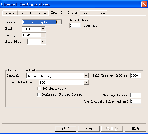 支持DF1协议,该协议兼容:SLC5/04、SLC500, 5/01,5/02 and 5/03、MicroLogix、PLC-5