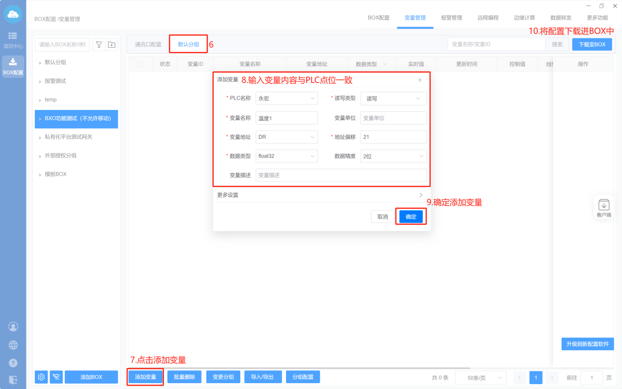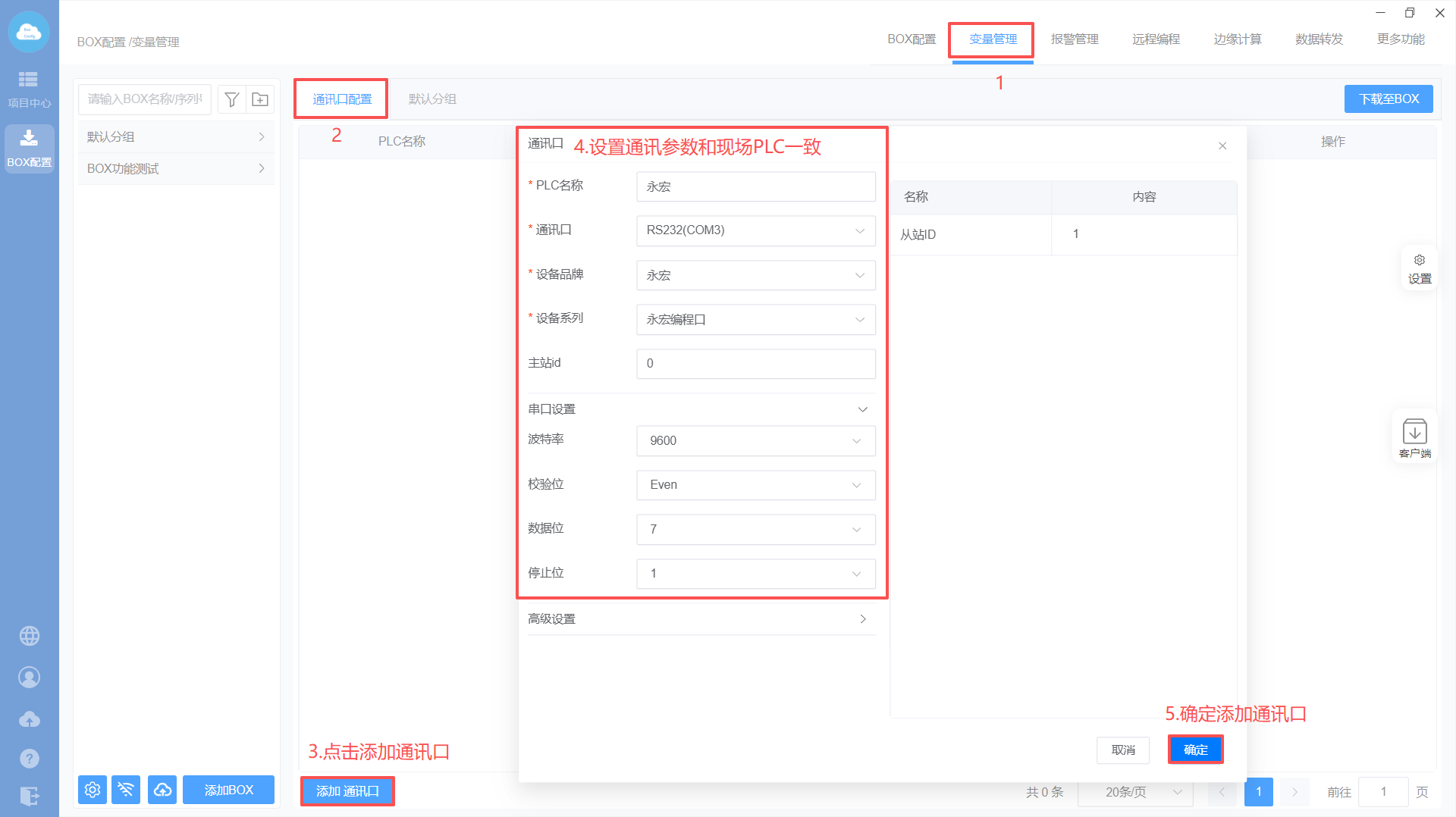Box配置(box和PLC的通讯参数保持一样,默认即可)
