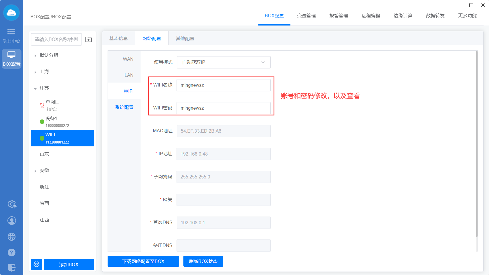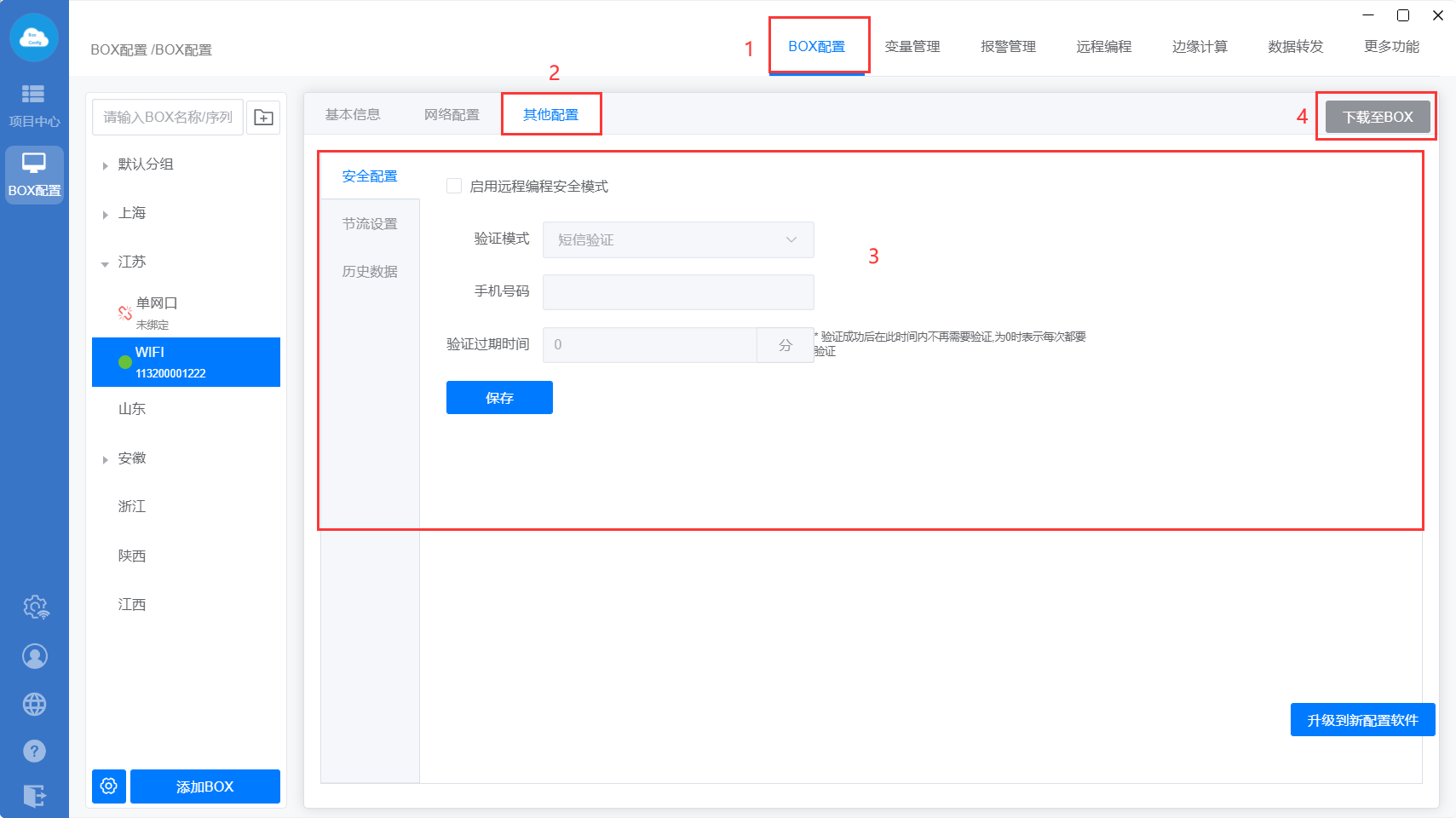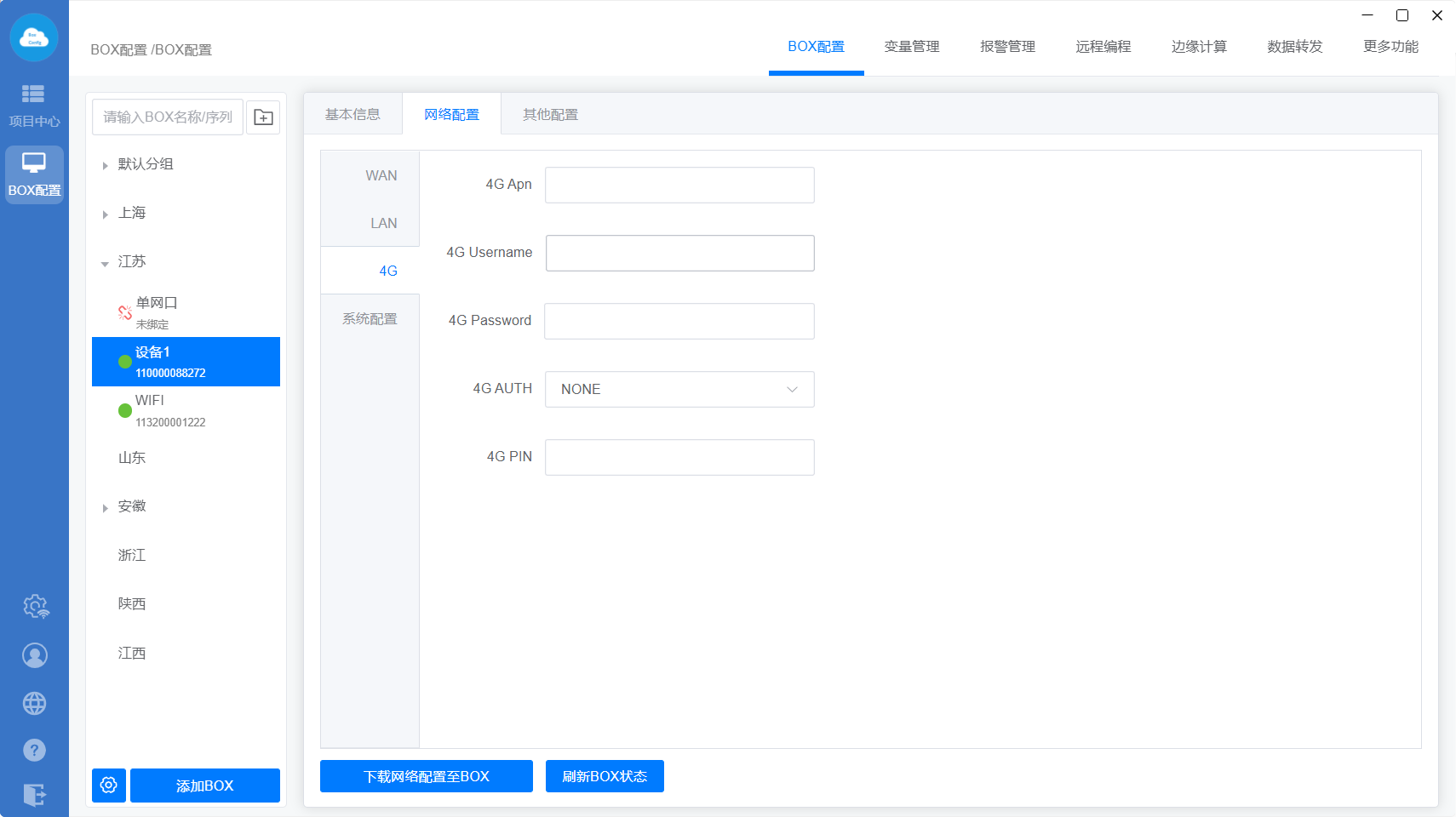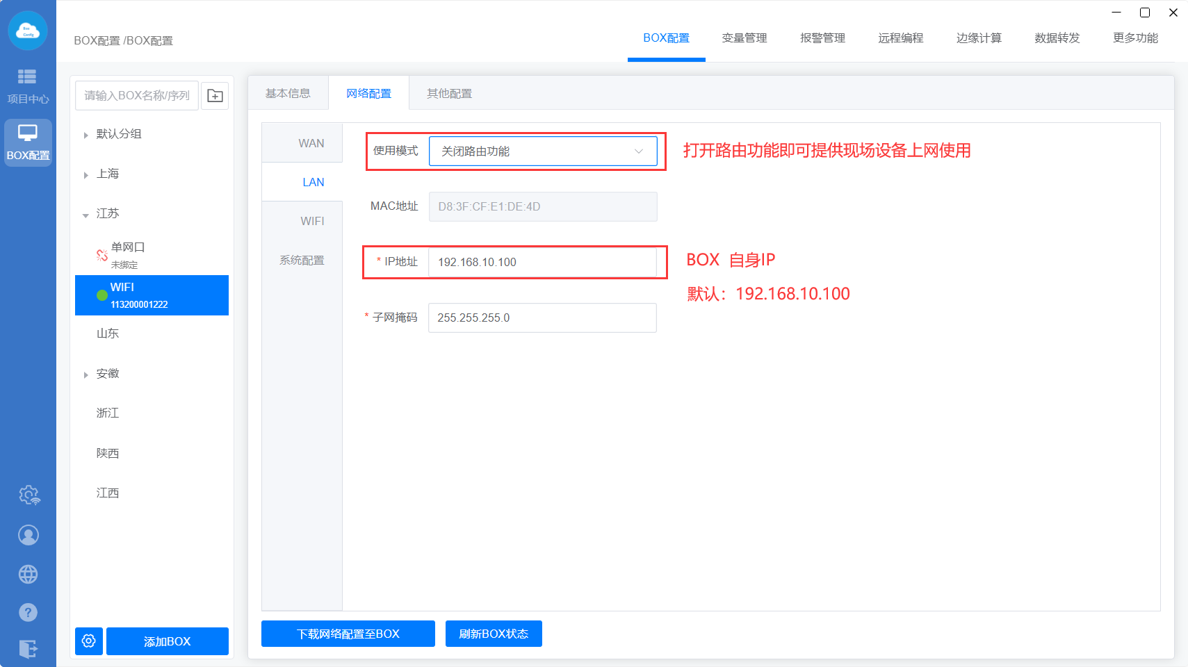 下载至BOX:把点表配置、更多功能、数据转发、边缘计算等设置直接同步到网关里面;