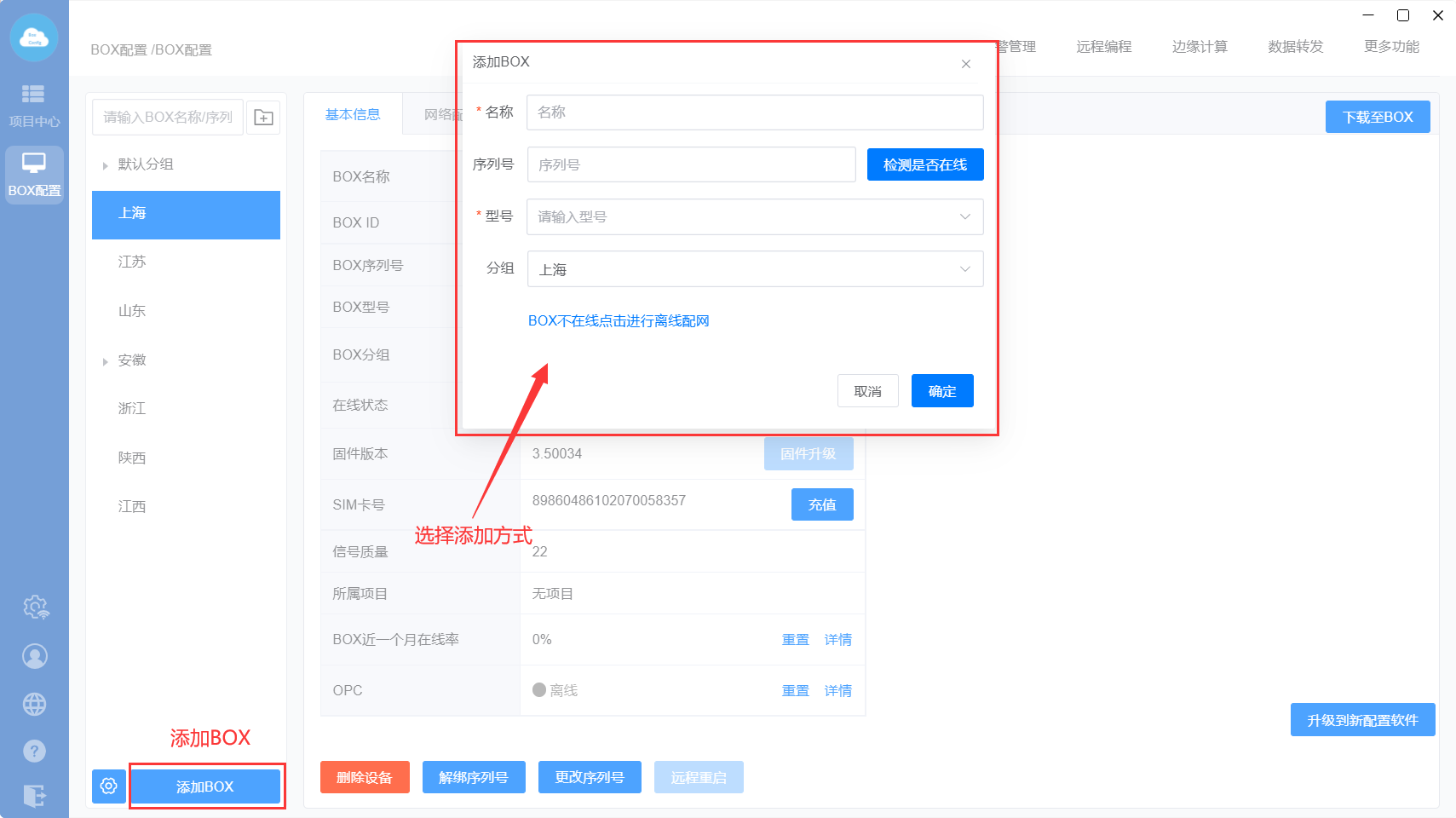 序列号:选填,如果填了序列号,该序列号必须在线才能添加成功;如果BOX不在线,请点击下面的“BOX不在线点击进行离线配网”