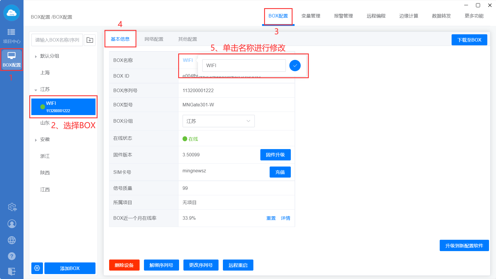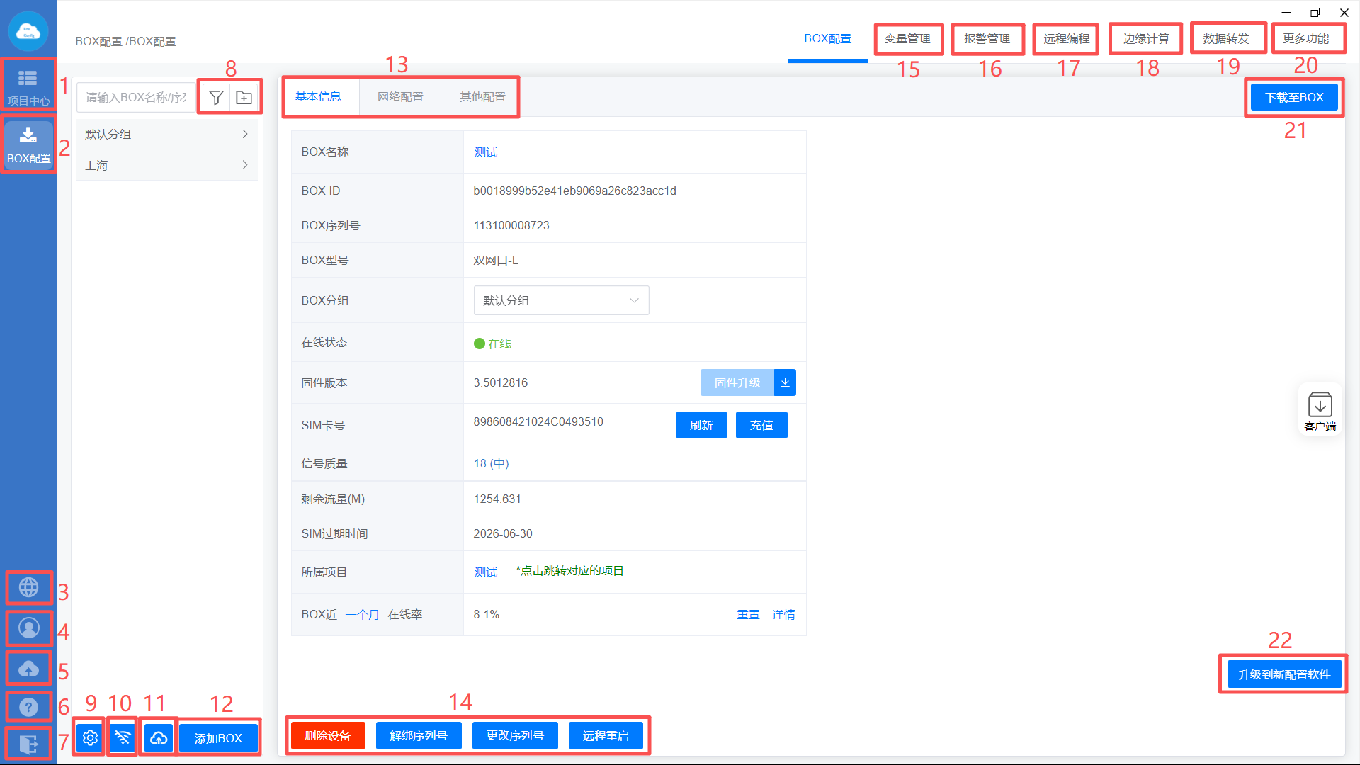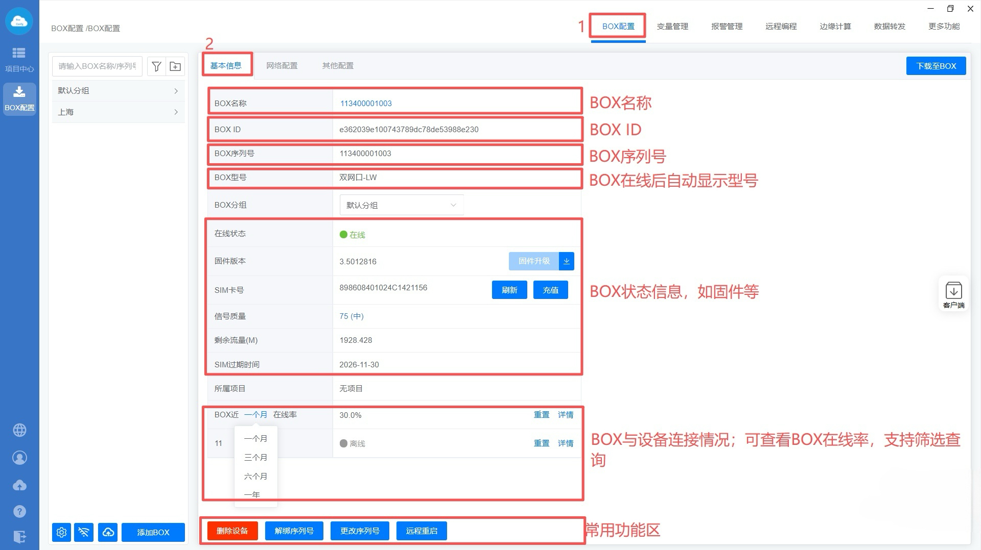 点击【BOX配置】—>【基本信息】,可查看BOX的参数,比如序列号,SIM卡号,BOX的在线率等。